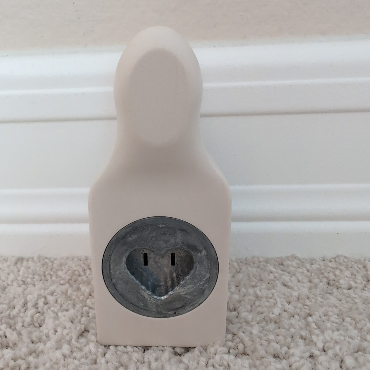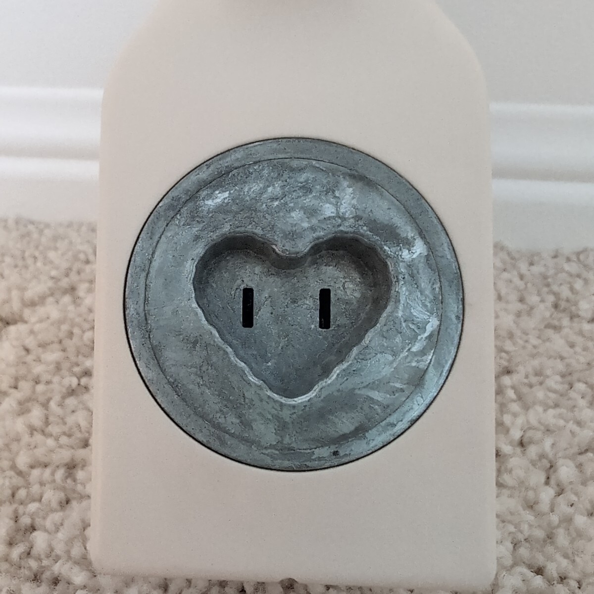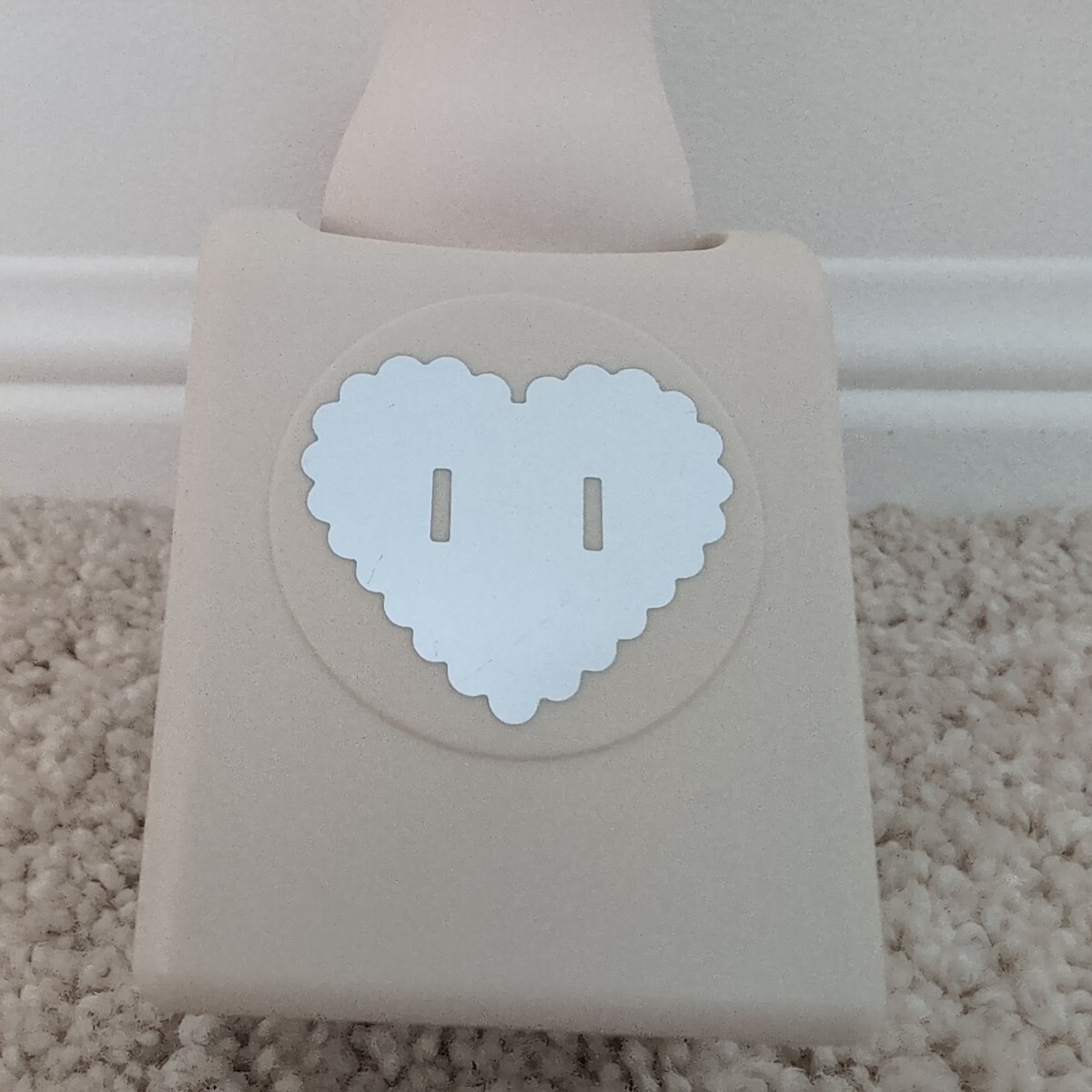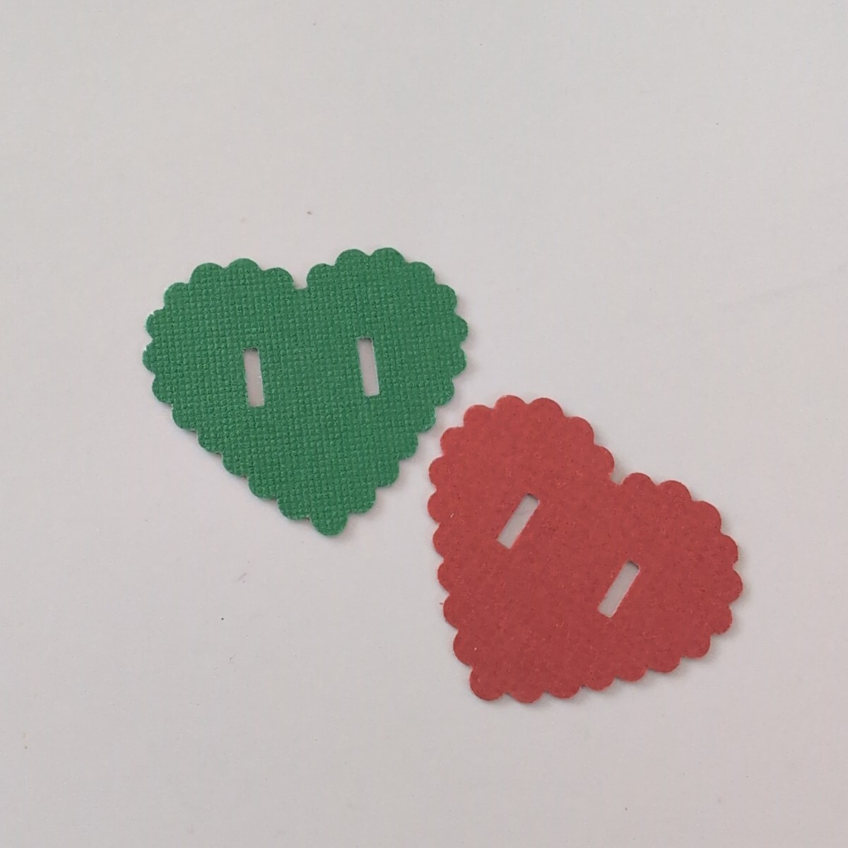 ハート型、リボン通せるように穴が空きます。こちらのパンチは、裏からカットされたものが出てくる物ではなく、パンチした後横から出てきます。