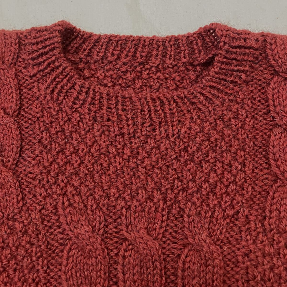 レンガ色のケーブルニットセーター、クルーネック、長袖。