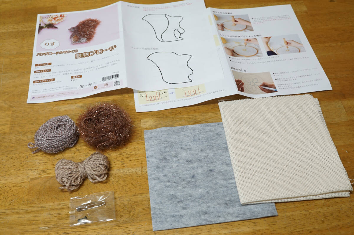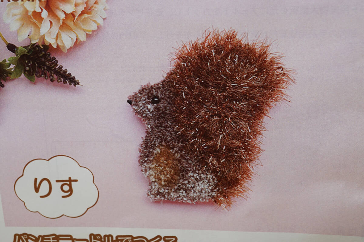 ブローチキット「りす」で、キット内容は「毛糸・パンチニードル専用布・フェルト・目玉パーツ・鼻パーツ・造花ピン・作り方レシピ・型紙」と、中細~並太毛糸用のパンチニードル刺繍用針で、出来上がりサイズは、たて約9cm×よこ約7.5cmでございます。