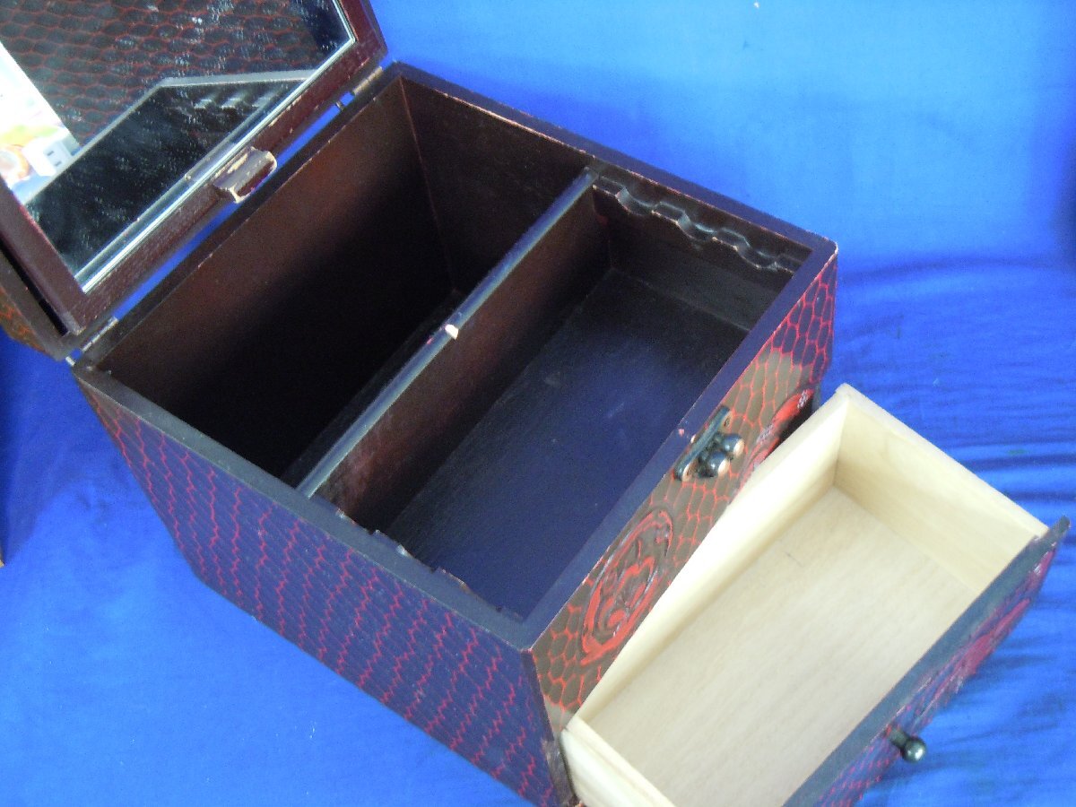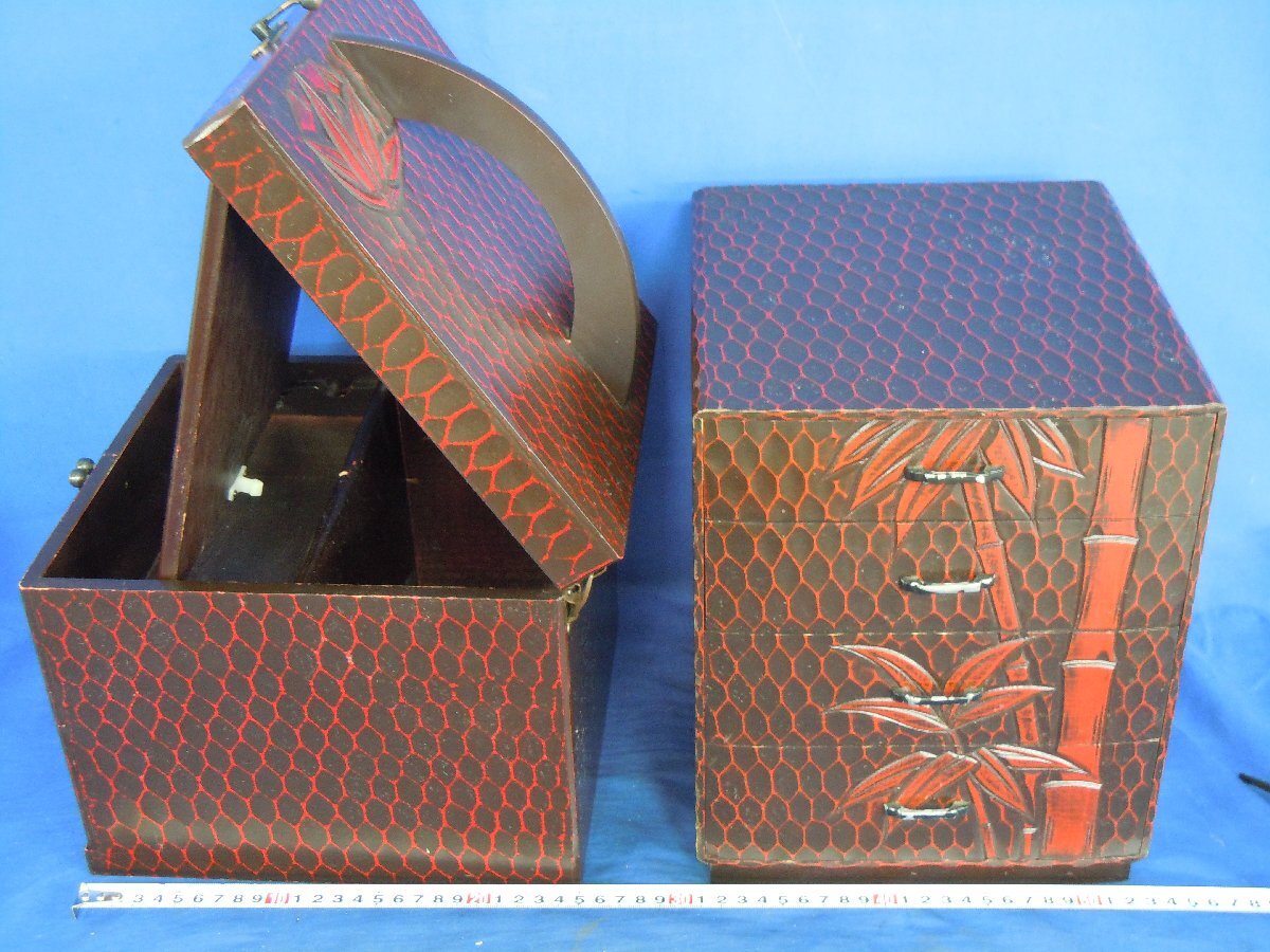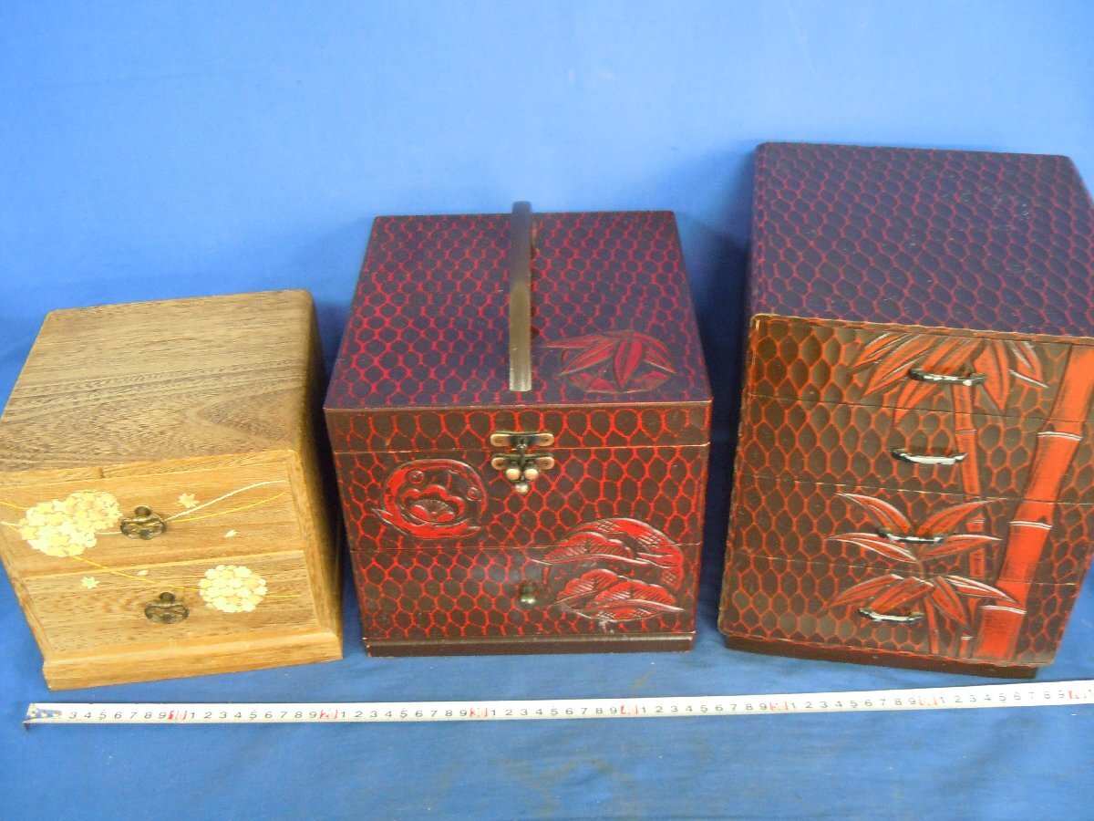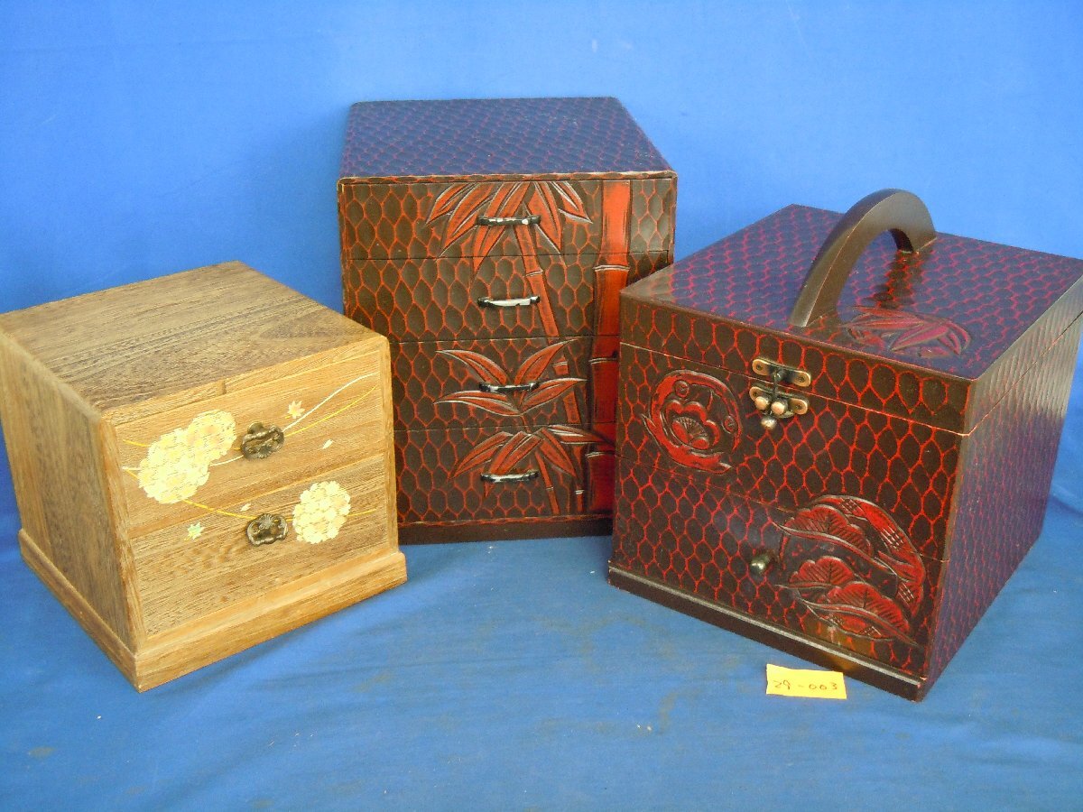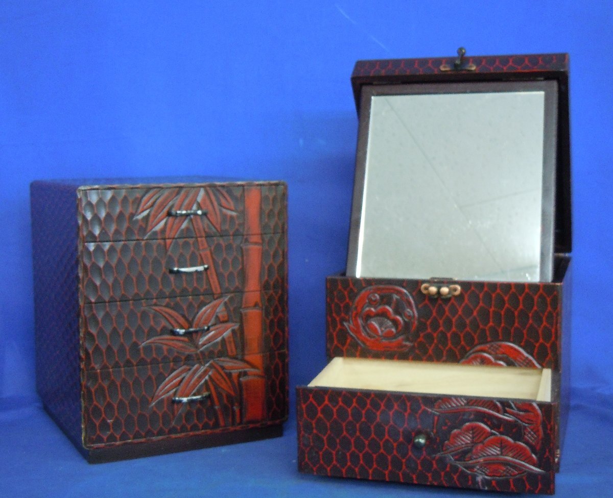 ●★29―003★木製家具 詳細不明 鎌倉彫 4段小引き出し/鏡付き小物入れ/2段 小タンス 3点まとめて/ウッド 収納 アンティーク[140]