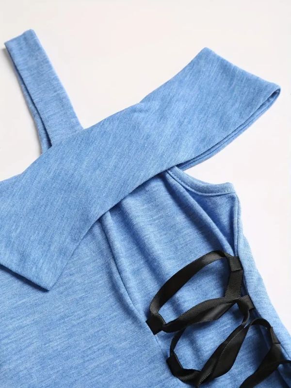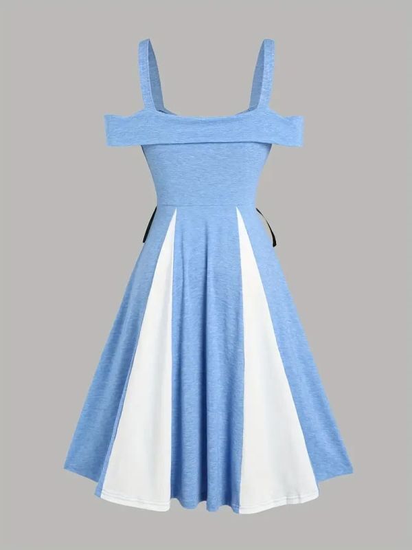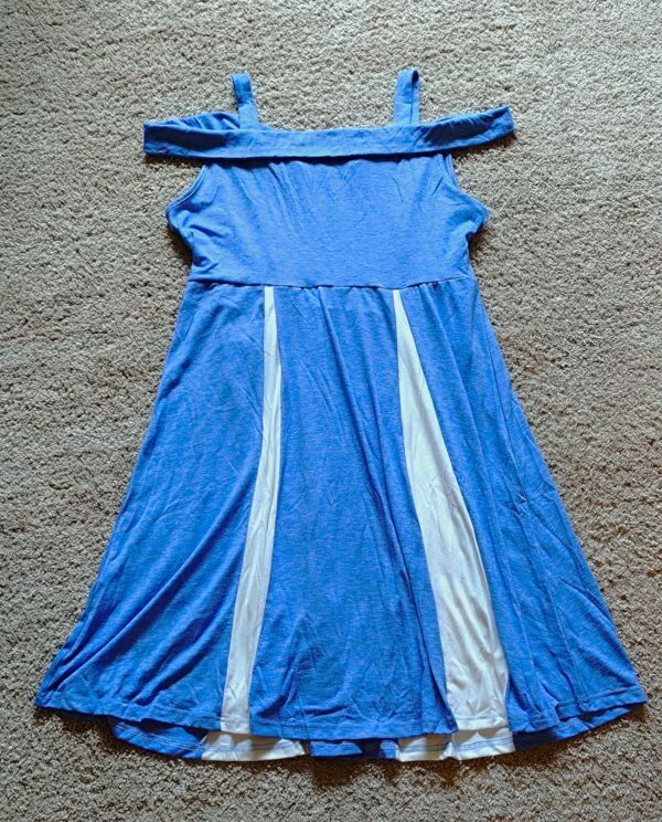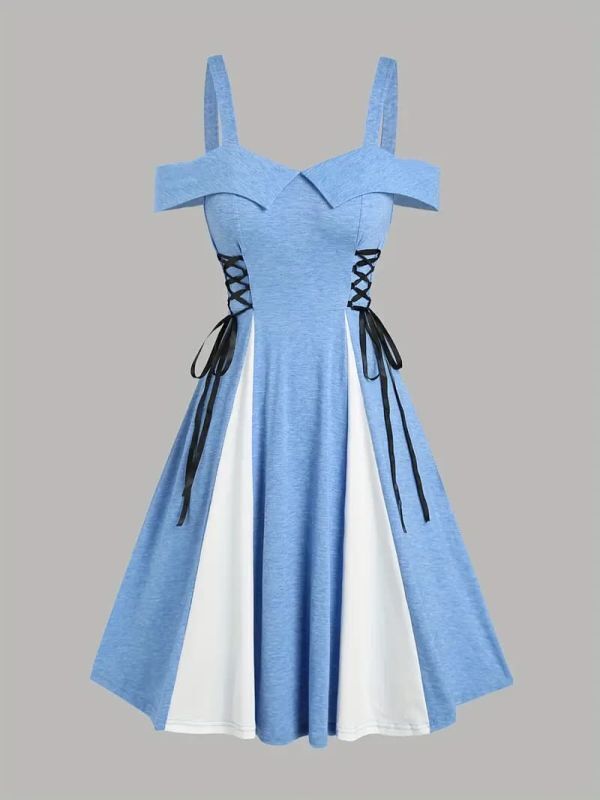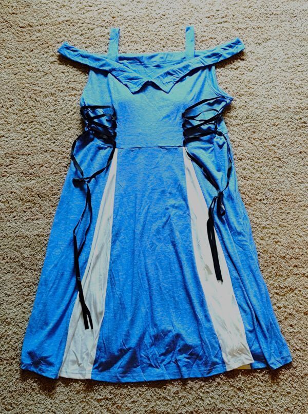空色ベースにスカートの白が映えるデザイン。サイドのリボンと合わせて可愛く着こなせます。