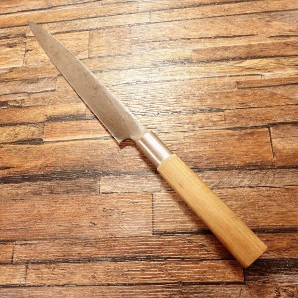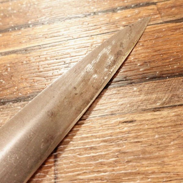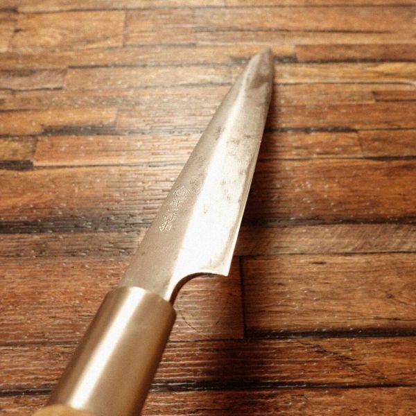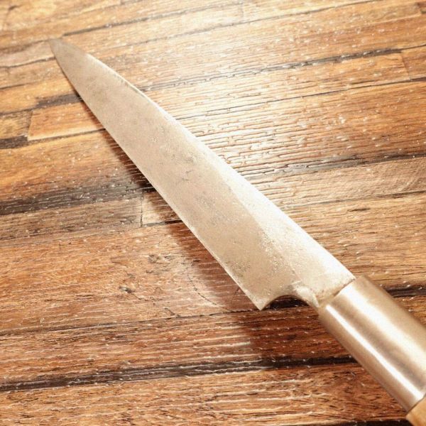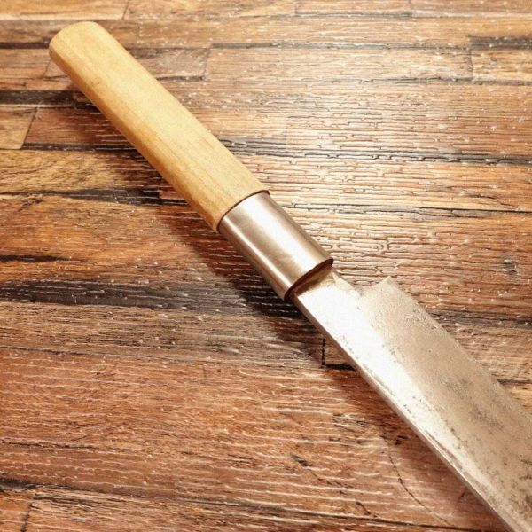 柳刃包丁は刺身などを美しく切り出すのに適した和包丁です。ハガネ特有の黒ずみは多少出ていますが、研いだ刃先はキレイな銀色が出ています。