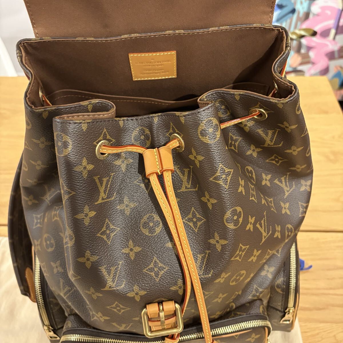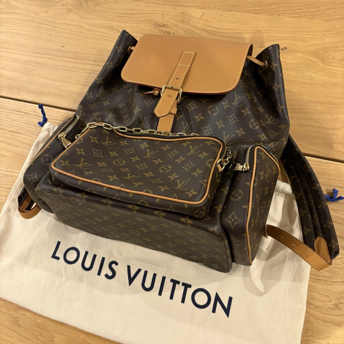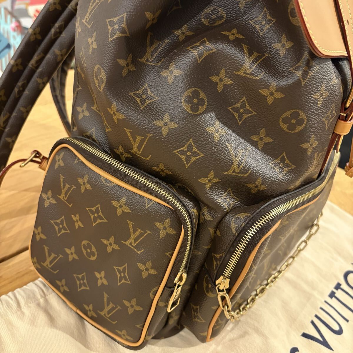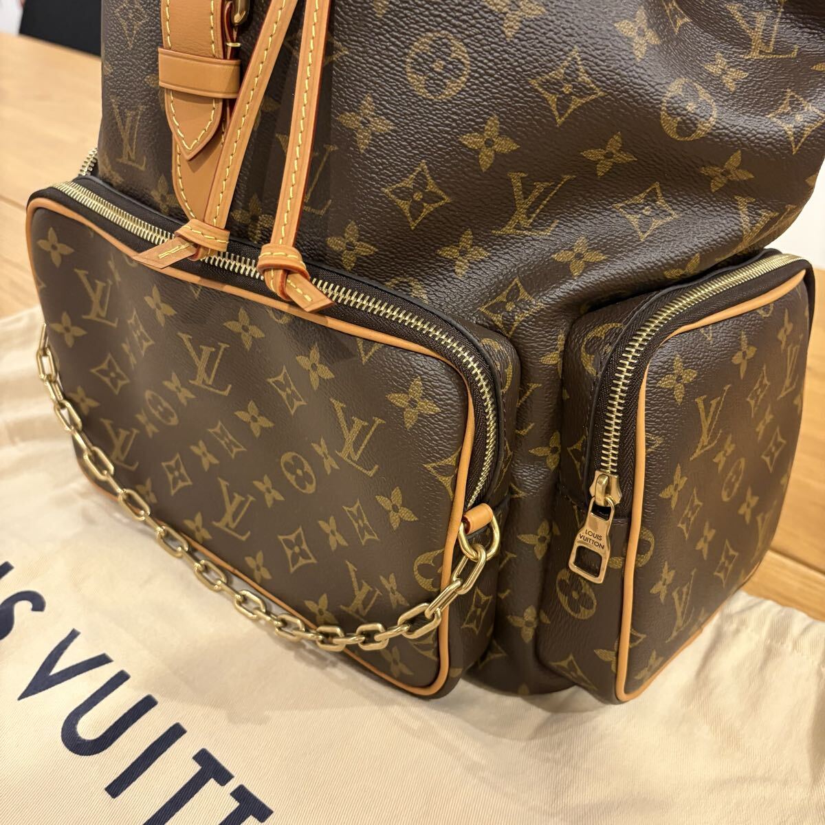 モノグラムパターンのLOUIS VUITTONリュック、フロントポケット付き。