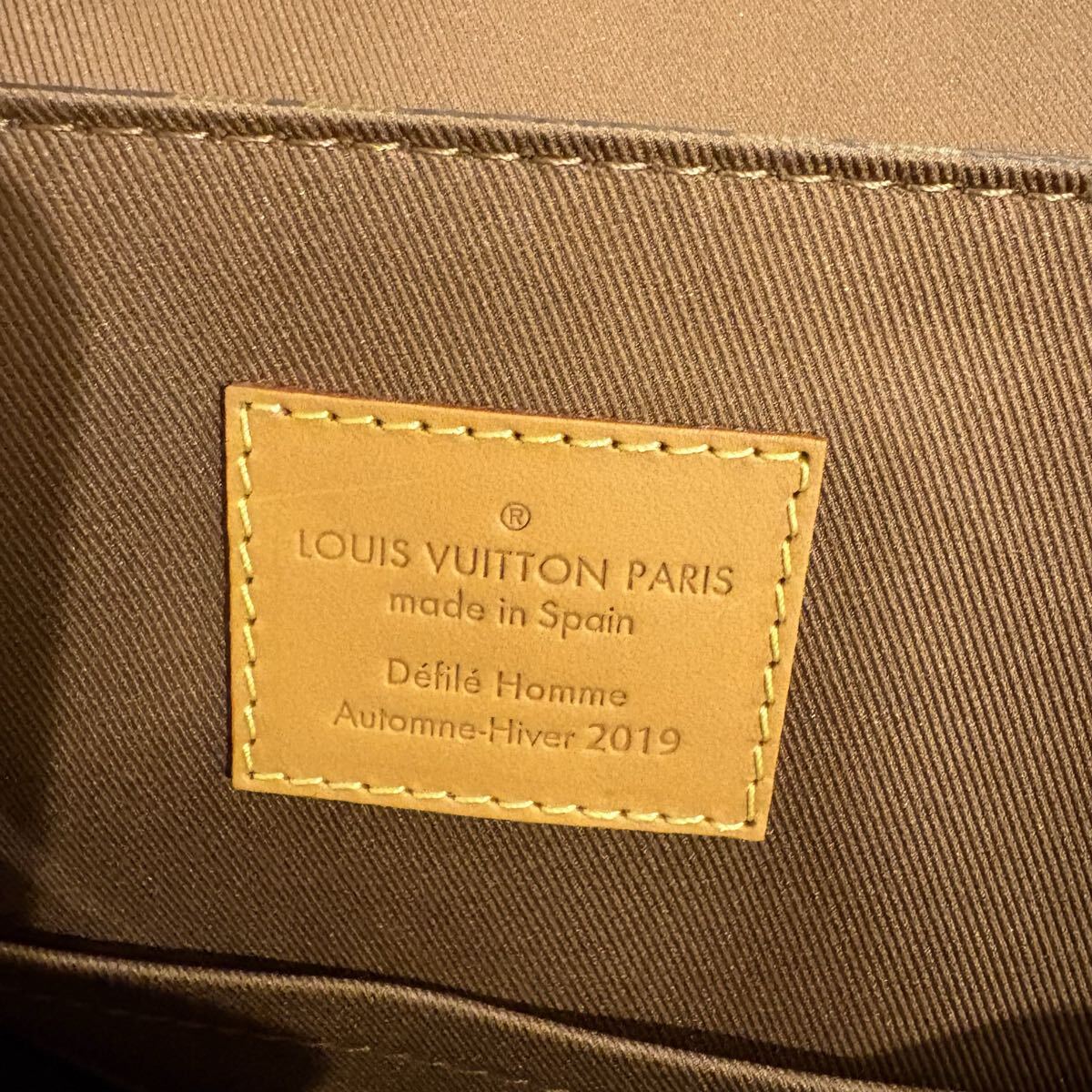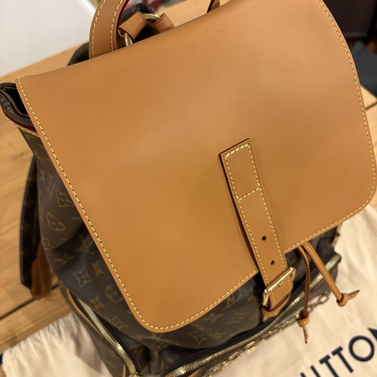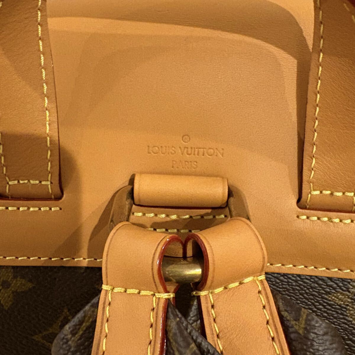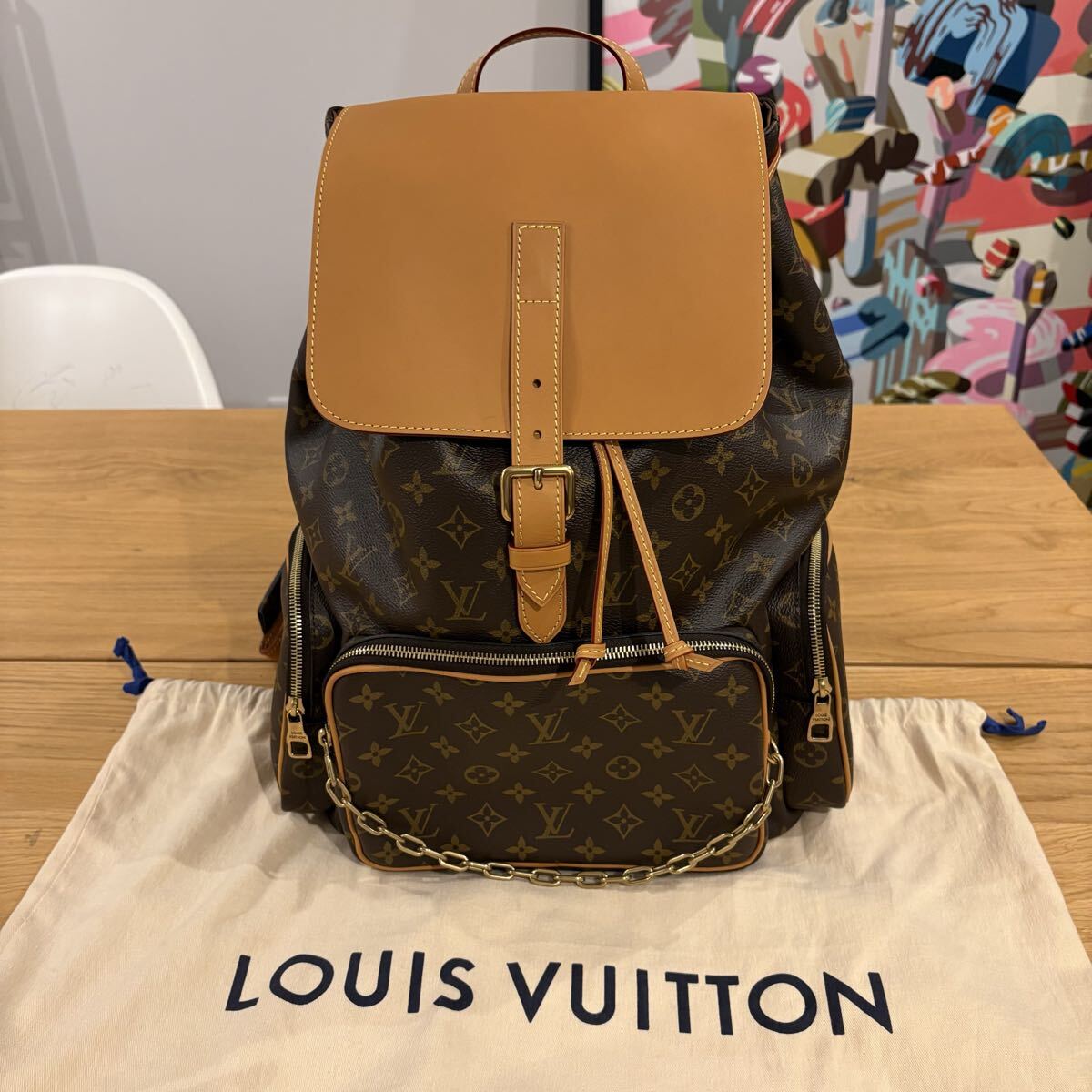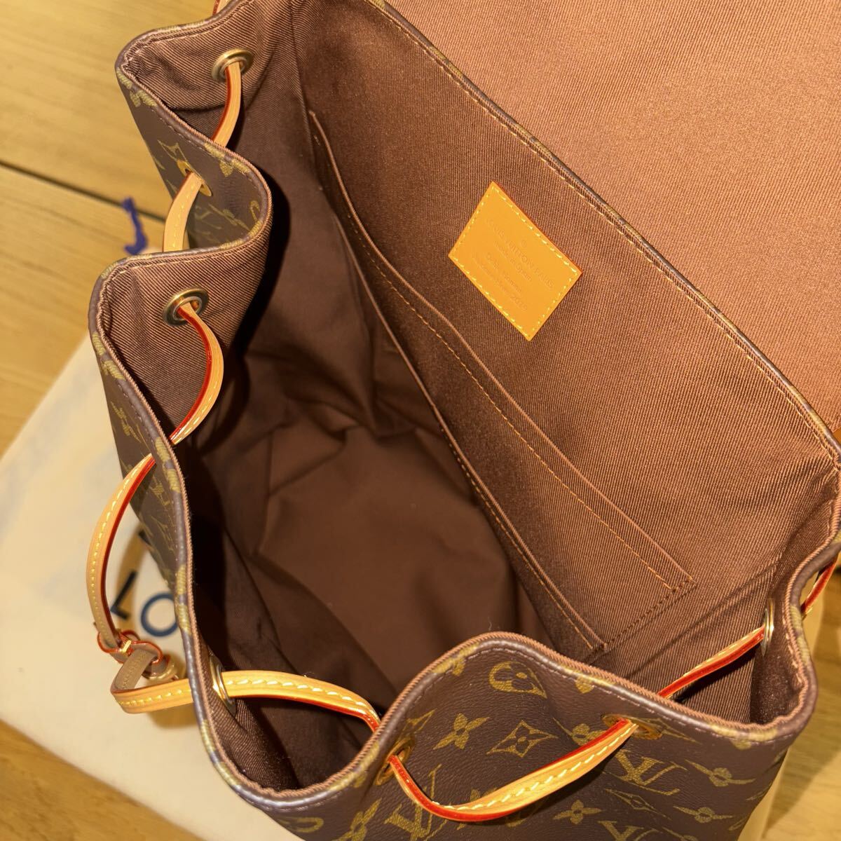 モノグラムパターンのLOUIS VUITTONリュック、フロントポケット付き。