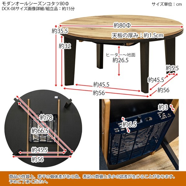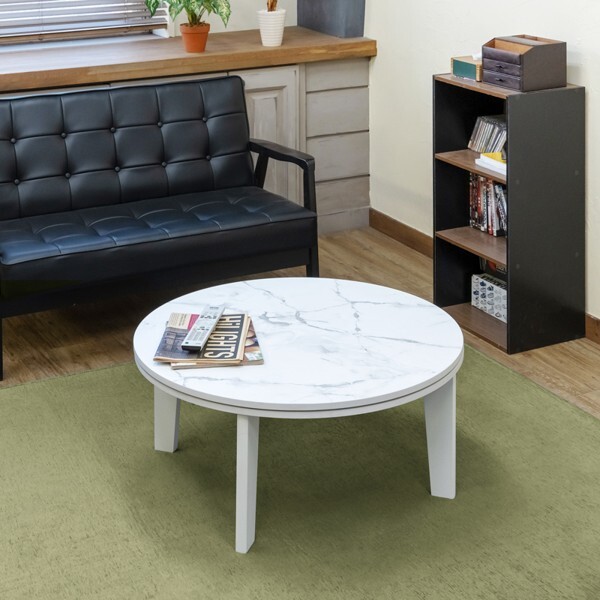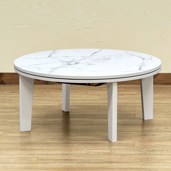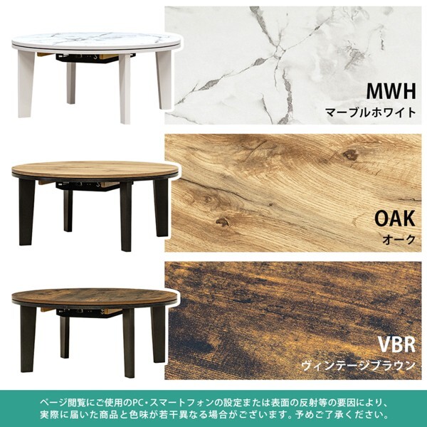 ※現在ご覧の商品ページはオークのご購入ページとなります。 ヤフオクの仕様上単一ページに複数バリエーションを掲載することができませんので、他バリエーションが希望の場合は別ページでご購入お願い致します。 配達業者を指定いただくことはできません。 沖縄県・離島配送不可となります。 ◆離島への発送は出来ません モダンオールシーズンコタツ 80cm 円形です 重厚なヴィンテージテイストの木目調天板が特徴の丸型コタツです。 向きを気にせず使える直径80cmの丸型天板です。 使用中コードを掛けるコードクリップ(ヒートン)が付いています。 温度調節はヒーターに付いているツマミで強弱を調整します。 コードの中間スイッチは入り切りのみです。 中天板(幕板)には、天板用滑り止めが付属しています。 マーブルホワイト(MWH)、オーク(OAK)、ヴィンテージブラウン(VBR)の3色展開です ※こたつ本体のみの販売です タイミングによっては在庫切れの場合があります。