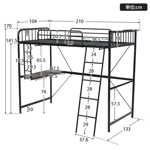 • 【安心して使える頑丈設計】ロフトベッドの裏面には、上下に「ハ」字形の補強クロスバーが設置されており、長期間の安定した使用ができる。直径4cmの丈夫な支柱でベッド全体を安全に支えてくれます。横揺れ・キシミを抑えて安心に使える。