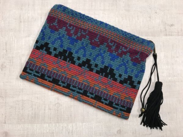 ピアサ PIASA タッセル付き マルチケース クラッチバッグ エスニック民族 ジャガード オリエンタル ラグ柄 レディース 青系 です。