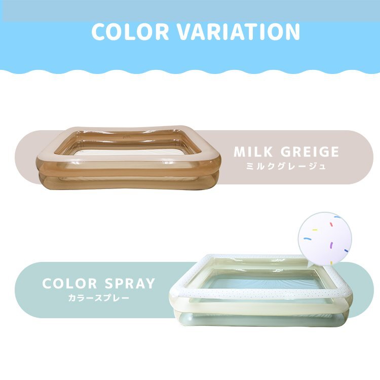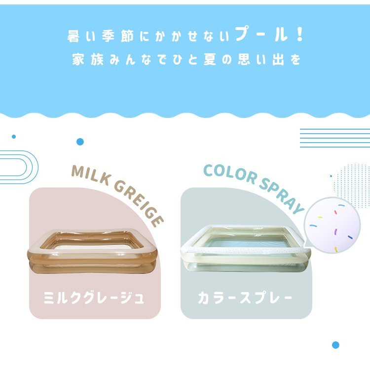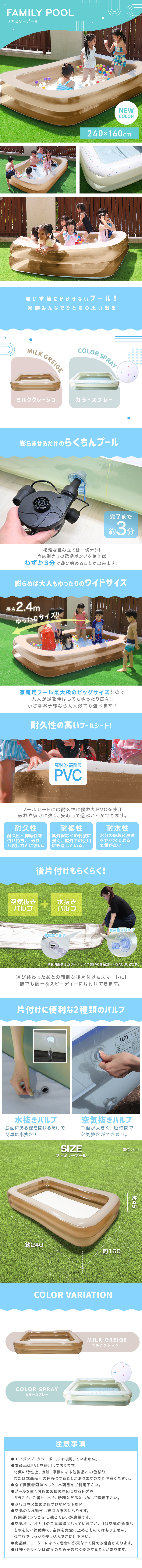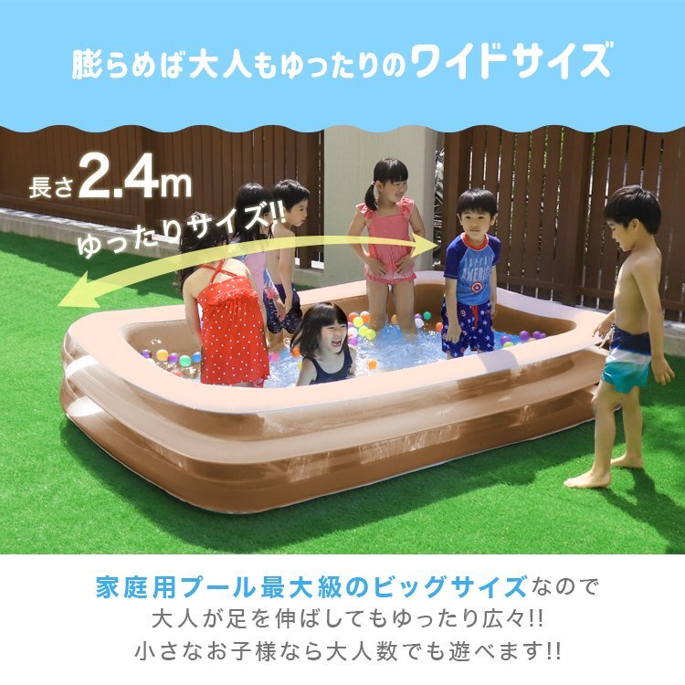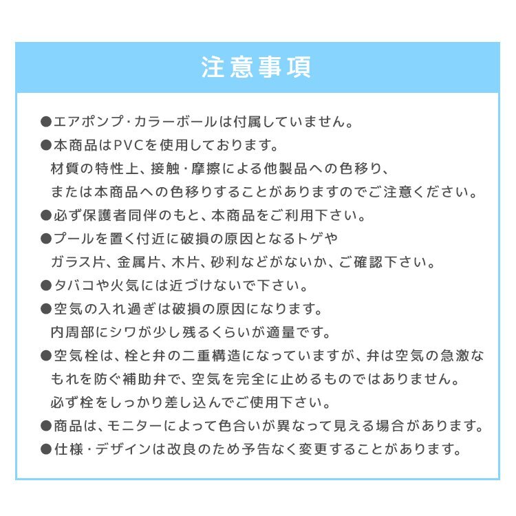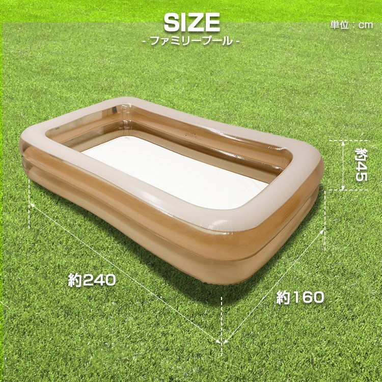 小さなプールでは物足りない・・・ そんな方にもご満足いただける、2.4メートルのジャンボファミリープールです。 子どもも大人も家族みんなで楽しめるBIGサイズ! 大人が脚を伸ばしても悠々くつろげるゆったり感! 子どもなら泳げちゃうくらい広々としています。 2気室仕様なので、大人が寄りかかっても倒れず頑丈です!! 【商品仕様】 カラー:ミルクグレージュ サイズ(約):240×160×高さ45cm 重量(約):5.65kg 材質:PVC 気室:2気室 対象年齢:4歳以上 【注意事項】 ※エアポンプは付属していません。 ※本商品はPVCを使用しております。材質の特性上、接触・摩擦による他製品への色移り、 または本商品への色移りすることがありますのでご注意ください。 ※必ず保護者同伴のもと、本商品をご利用下さい。 ※空気の入れ過ぎは破損の原因になります。内周部にシワが少し残るくらいが適量です。 ※空気栓は、栓と弁の二重構造になっていますが、弁は空気の急激なもれを防ぐ補助弁で、空気を完全に止めるものではありません。 必ず栓をしっかり差し込んでご使用下さい。 ※プールは安定した平らな場所でご使用下さい。傾斜のある場所、タイル・煉瓦など目地や段差のある場所でのご使用は変形・破損の原因になりますので避けて下さい。また、表面に塗装・コーティング等の処理された場所でのご使用は塗装等が変色したりプール本体に色移りすることがあります。ご注意下さい。 ※商品は、モニターによって色合いが異なって見える場合があります。 ※仕様・デザインは改良のため予告なく変更することがあります。 【もちろん新品未使用品です】 ▼検索キーワード プール ビニールプール 家庭用プール 子供用 ビニール 大型プール ファミリー 自宅用 キッズプール キッズプレイプール ファミリープール ベランダ おしゃれ かわいい バルコニー 庭 キッズ 子ども用 水遊び 長方形 四角 電動 大きい 庭 ベランダ テラス 電動ポンプ 空気 プール 電動エアーポンプ 電動 ポンプ 空気入れ 電動ポンプ AC電源 100V 家庭用 コンセント 電動ポンプ DC DC12V シガーソケット 吸気 排気 給排気 簡単 便利 エアーベッド 空気入れ 人気 おすすめ |