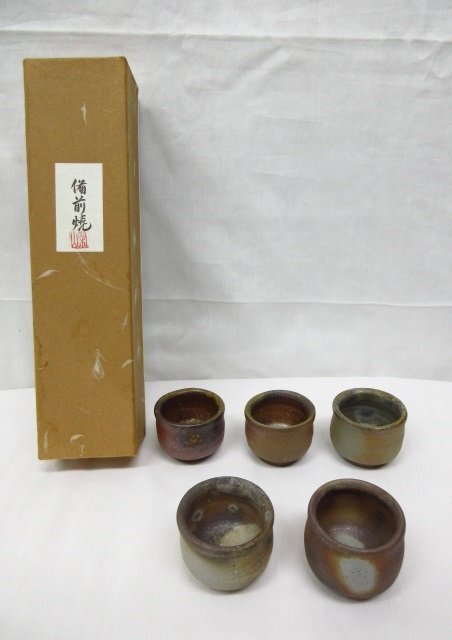h4918 未使用保管品 ぐい呑み 5個セット おちょこ 備前焼 陶器 山関 酒器 ブラウン系 セット