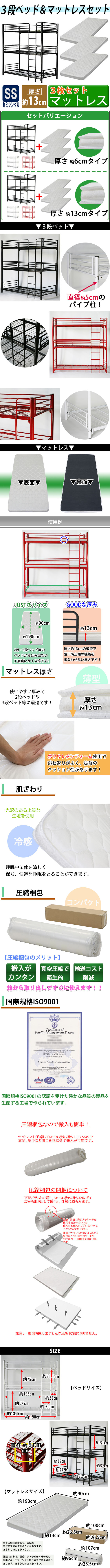 | 商品名 | 送料無料 3段ベッド 三段ベッド 快適マットレス付き 3枚 セミシングルベッドマットレス セミシングル マットレス 厚さ約13cm 圧縮 コンパクト ポリウレタンフォーム ウレタン セミシングルマット スチールベッド パイプベッド ベッド 寝具 ブラック bed142007ss3p |