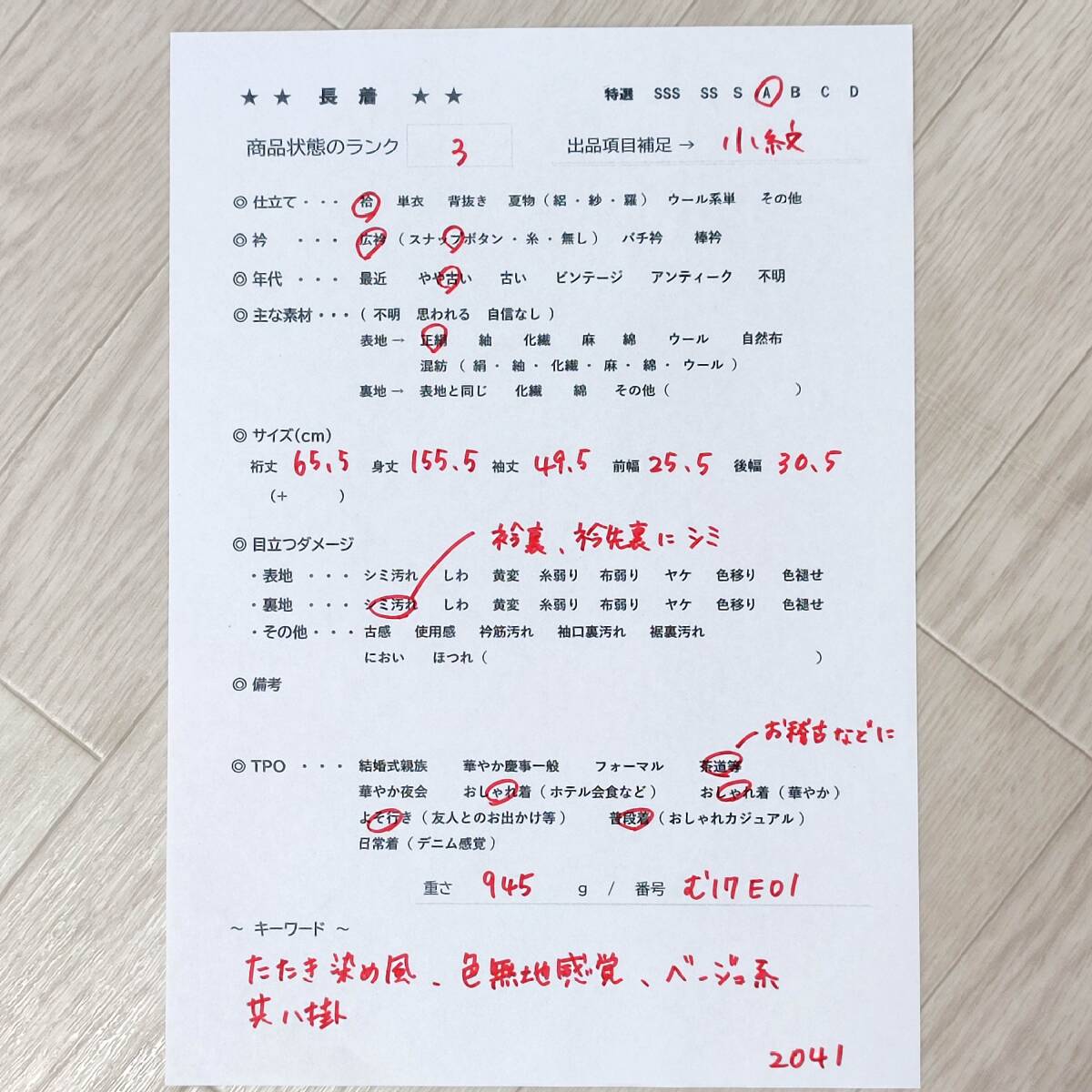 4 | 汚れやシミ等が激しいため、着用の判断が分かれるお品です。出品者としましては、ハギレとして出品いたし ます。古いものをご理解いただける方やお手入れをしていただける方でしたら、ご着用可能な場合も有ると思います。ノンクレームノンリターンでお願いいたします。 |