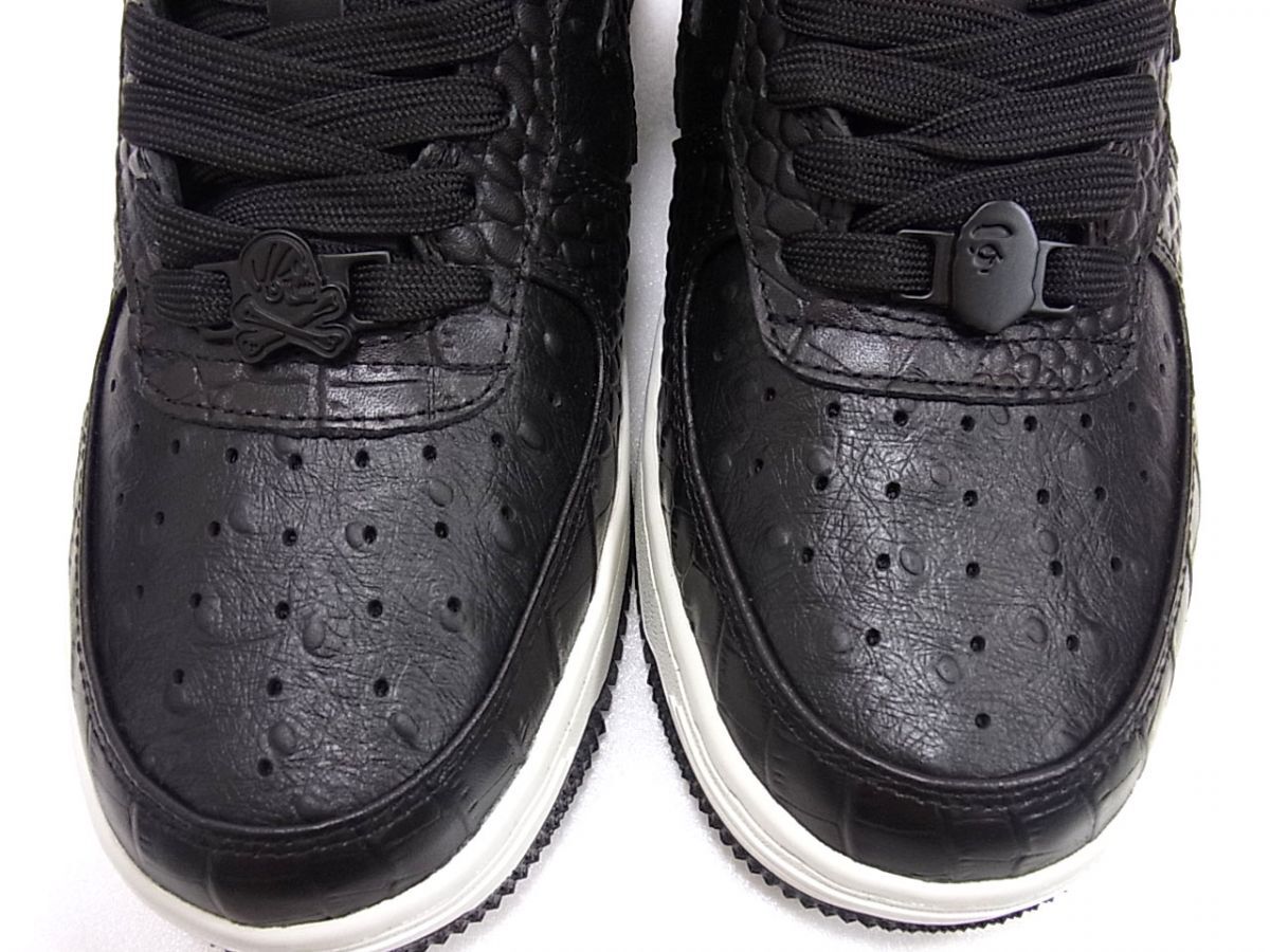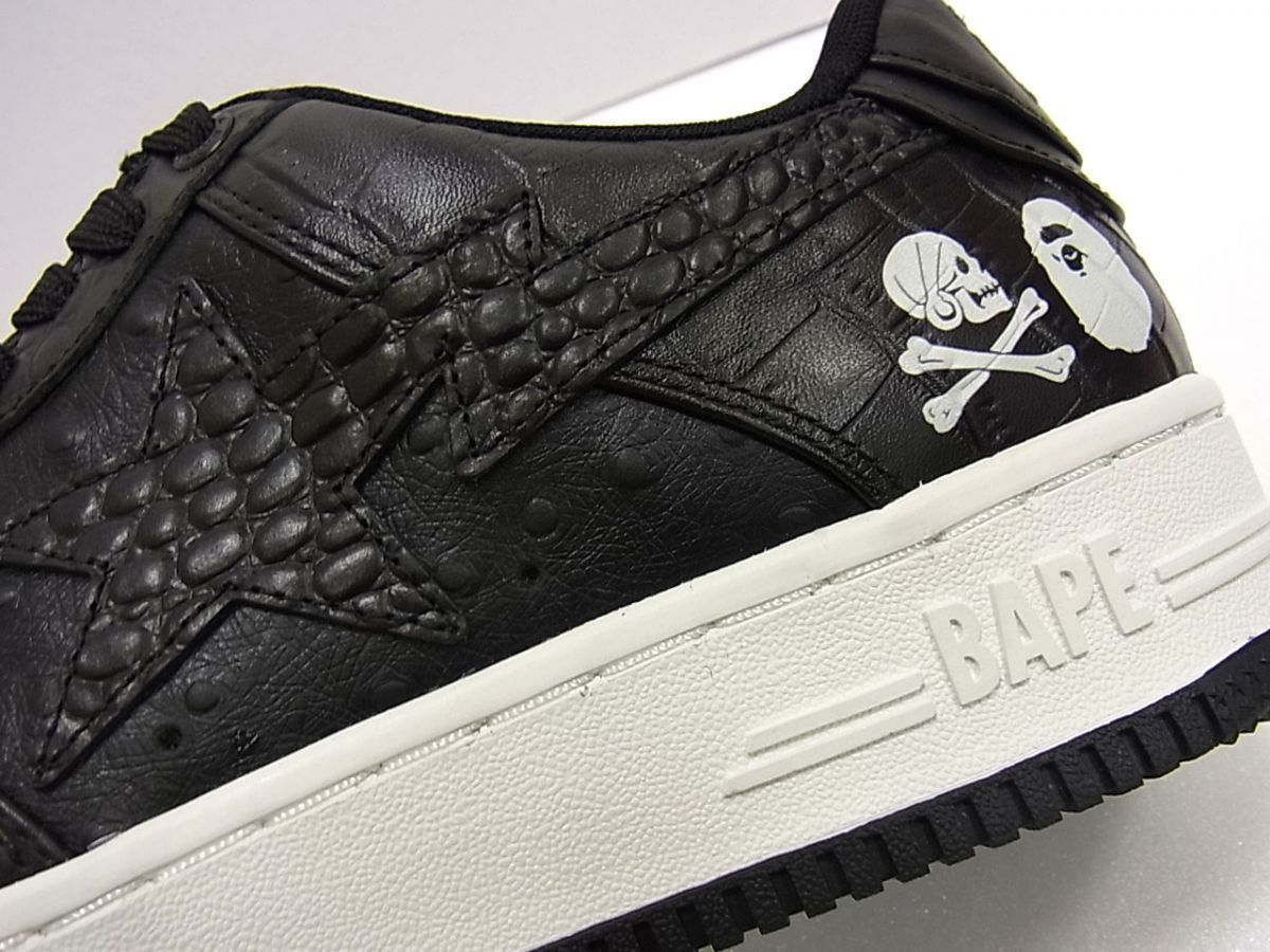 ヒールサイドにスカルクロスボーンとエイプヘッドのプリント、ヒールにはBAPESTAとNBHDのロゴがアシンメトリーに刺繍されています。
