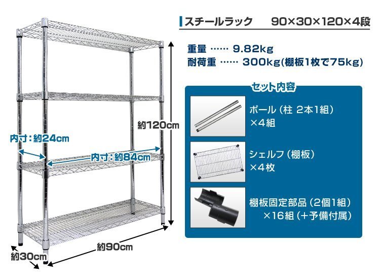 \どんなお部屋にも合わせやすいスチールラックです/ クギやネジを使わずに簡単に組み立て出来ます! 棚の高さを自由に変えることができます。 一人暮らしのお部屋やリビング、キッチン、物置など場所を問わず活躍できます。 アパレルショップの店頭用やオフィスにも使用されています。 ぐらつき防止アジャスター付き! ■商品コード:MR09AB4 ■商品仕様 サイズ(約):幅90×奥行30×高さ120cm 耐荷重(約):(全体)300kg / (棚板1枚あたり)75kg 材質:スチール(クロームメッキ)、ABS樹脂他 重量(約):9.8kg ■内容 シェルフ(棚板) ×4 ポール(ジョイント式) ×4 棚板固定部品 ×16(+予備付属) 標準アジャスター(固定足) ×4 ■注意事項 ・海外製品で、簡易梱包での輸入のため風防に擦れや多少の小キズなどがある場合がございますが、 商品自体には問題ありませんのでご了承下さい。 ・商品は、モニターによって色合いが異なって見える場合があります。 ・仕様・デザインは改良のため予告なく変更することがあります。 ■保障期間 7日間 ※商品到着後7日以内の初期不良・破損のみご対応させていただきます。 【新品未使用品です】 |