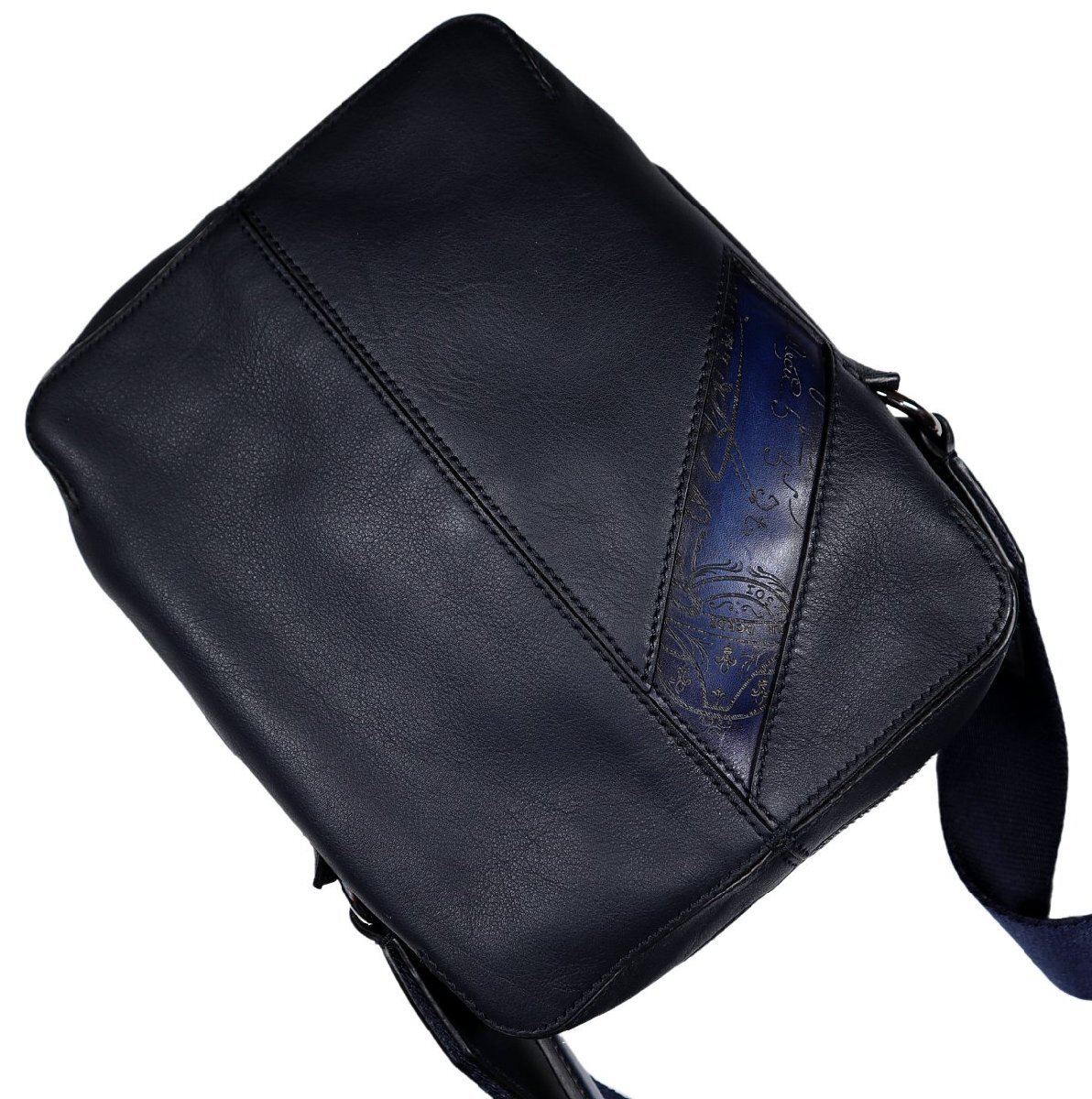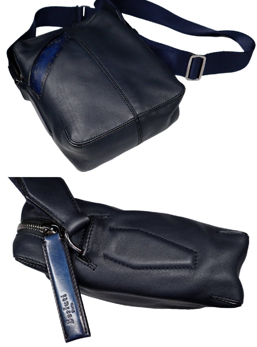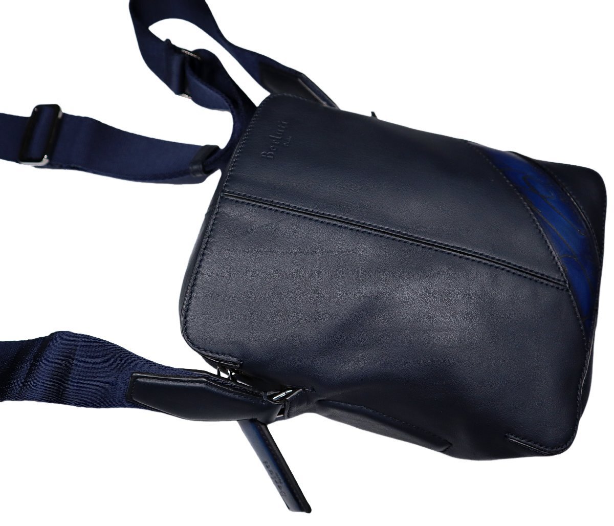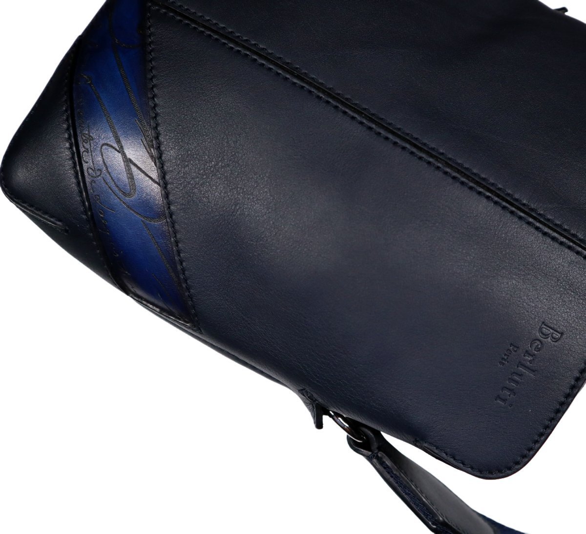ダークネイビー × ブルー 柔らかくしなやかでナチュラルな風合いを持つ極上レザーのダークネイビ―色に、美しいブルー色パティーヌを施したヴェネチアレザーを「パッチワーク」で表現。「パッチワーク」には、18世紀頃のカリグラフィーをモチーフとした「スクリット柄」を表裏非対称に刻印。「ベルルッティ」ならではの伝統的な芸術性が如実に表れた唯一無二のデザインで、見るからに ”ラグジュアリーなオーラ” を放っています! ショルダーストラップは光の加減によってブルーが出てくるネイビー色で、内側は高級車やスポーツカーの内装に採用されている「アルカンターラ・スエード」を使用したブルー色です。