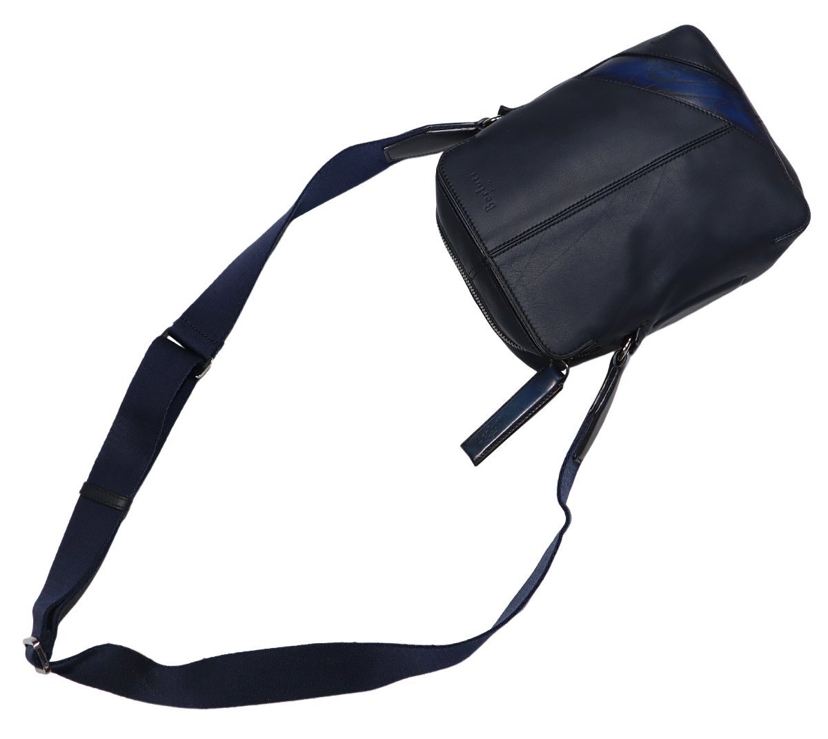 数あるメゾンブランドの中でも、アーティスティックな表現においては一頭地を抜く「ベルルッティ」。そのアイコン的存在が、ご存じ「スクリット柄」です。18世紀頃の古文書に書かれた美しく独特な文字をモチーフとした「スクリット柄」は、優雅かつどこか神秘的な表現でファッションを虜にしています。そんな「スクリット柄」の魅力をこちらはパッチワークで表現した「ラピエセ・ルプリゼ」コレクションのボディバッグ(ショルダーバッグ)。 「ラピエセ」とはパッチなどを当てて修復すること、「ルプリゼ」は修復を重ねることを指しており、つまりは ”大切な愛用品を修繕して使う” という意味から名づけられています。かつて「アンディー・ウォーホル」がリクエストした「つぎはぎ」にインスピレーションを受けて、4代目の「オルガ・ベルルッティ」によって生み出されたデザインです。良いものを長く使うという思考が、レザーをつなぎ合わせるというアイコニックなデザインで表現され、今や「ベルルッティ」のラグジュアリーを代表するデザインになっています。 こちらはその「パッチワーク」を、独特の色付け方法「パティーヌ」を施した「ヴェネチアレザー」にて表現。さらに18世紀頃の古文書に書かれた美しく独特な文字をモチーフとした「スクリット柄」をアシメトリックでデザインすることにより、優雅かつどこか神秘的に仕上げています。深めのネイビーに映えるブルーカラーも非常にかっこよく、ネイビーブルー好きのアッパクラスの方にはぴたりとハマるでしょう!