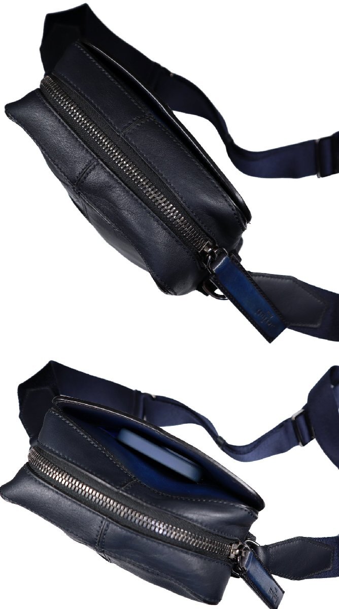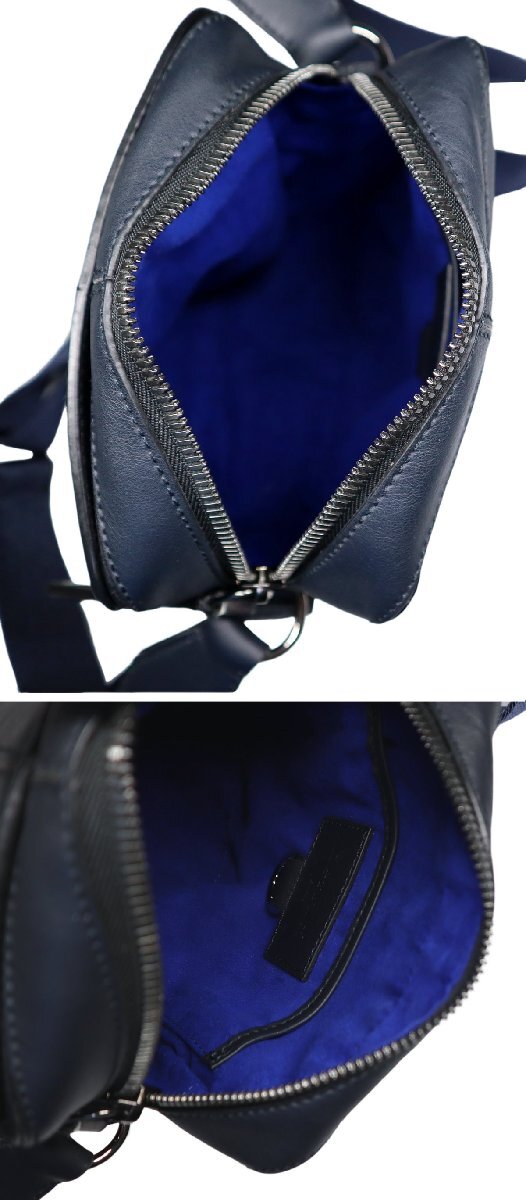 大きめのジップトップや外側の差し込みポケット部分にも「パティーヌ」を施した「ヴェネチアレザー」を採用しています。 ショルダーストラップは長さの調整が容易で、ショルダーにかけても斜め掛けもできます。大き過ぎず小さ過ぎずのちょうどいいサイズ感で使いやすいでしょう。 内側には「アルカンターラ・スエード」を採用。高級車やスポーツカーの内装に使用されることの多い「人工スエード素材」で、本来のスエードのように色移りすることがなく、丈夫で、汚れにも強いです。 内側のポケットには、レザートリミングを施したパッチポケットが1つ、真鍮キーリングが1つ付きます。 もちろん熟練した職人のハンドメイド製で、作りの良さは間違いありません。 天然素材独特の細かいキズや揉み柄のムラ、斑点などが見られる場合がありますが、これは天然素材独特の風合いであり、欠陥ではありません。画像でもわかります通り、本体のレザーは恐らくタンニン鞣ししたレザーだと思いますが、自然なシワ感、スレ感があります。ブルー部分のお色のムラ感はそういった仕様です。使用すればすぐできるような、細かいキズやスレ、シワなどはあるとお考えの上ご入札ください。 非常にラグジュアリーで希少なボディバッグをお安くお譲りしますので、気に入った方はぜひどうぞ! ネイビーやブルーのスタイルにここまで合うラグジュアリーなバッグはなかなかないでしょう!