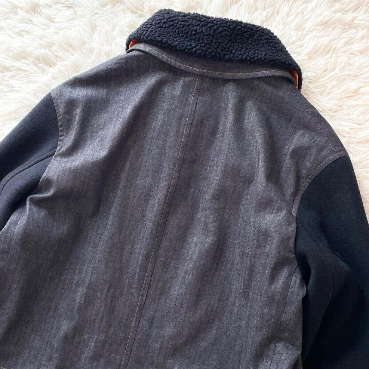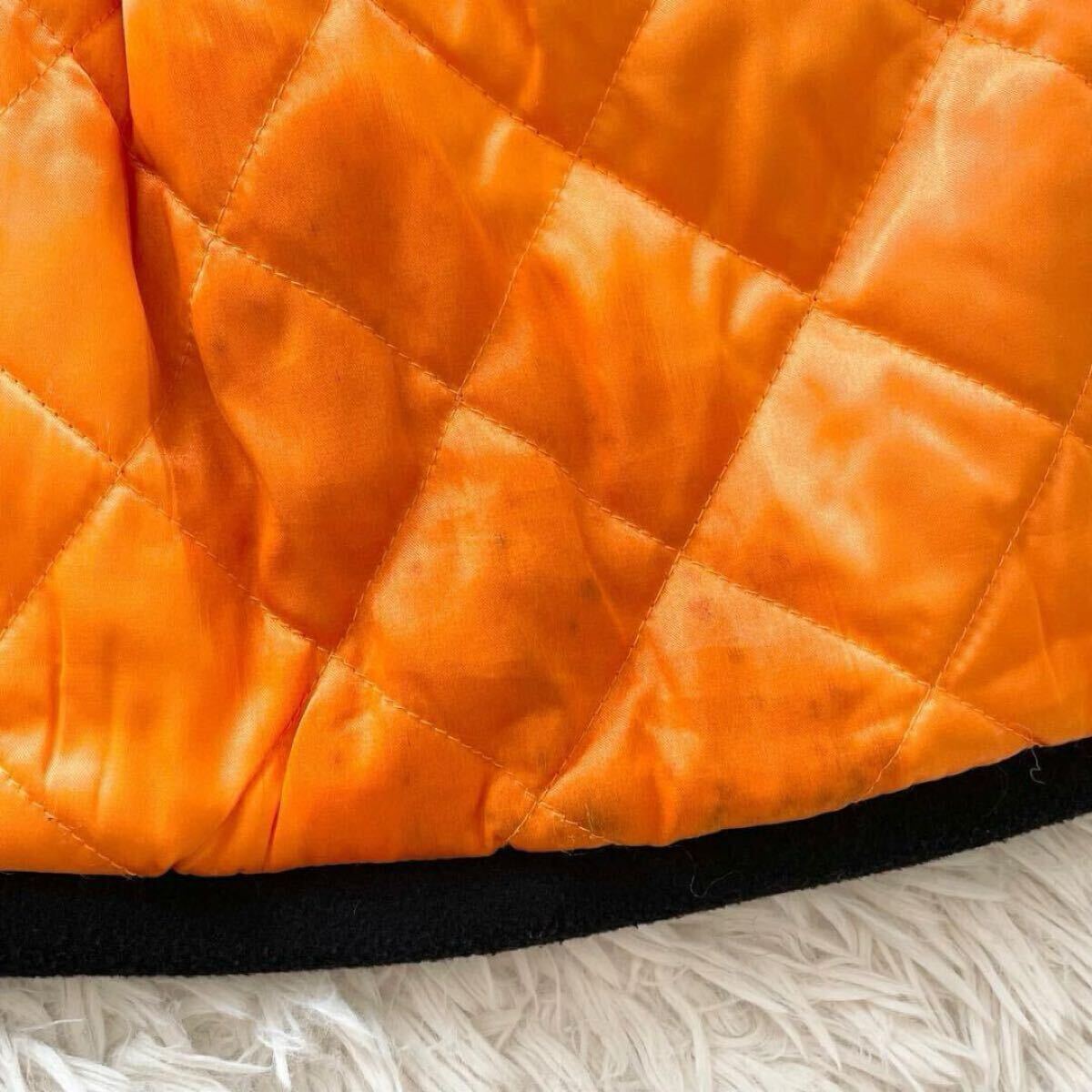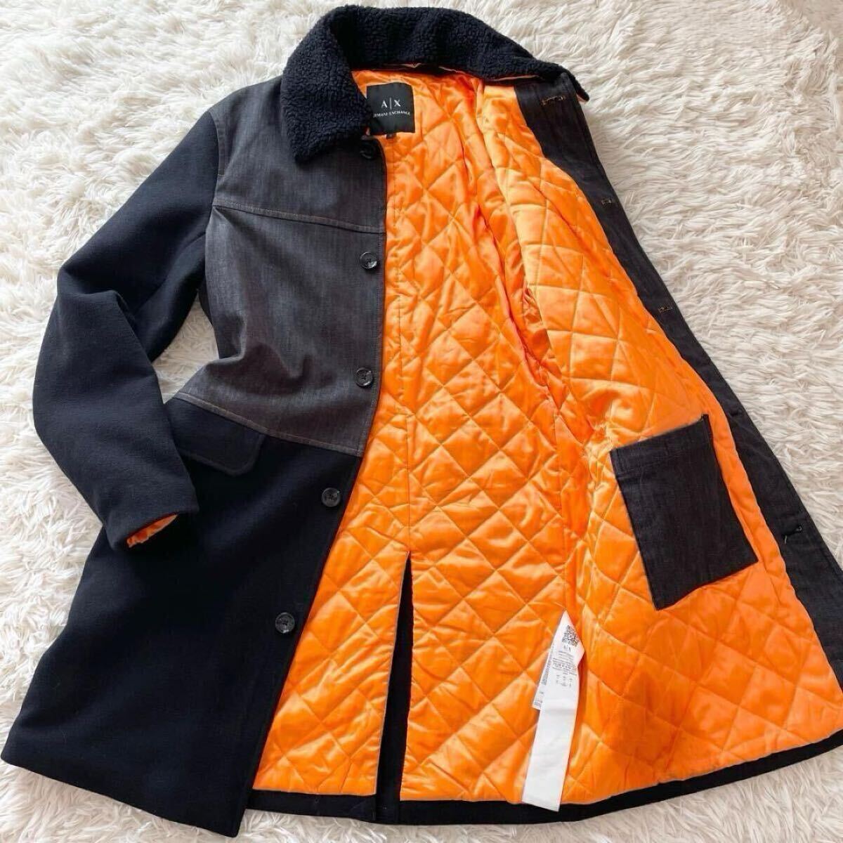 着脱可能なボア襟と、内側の光沢オレンジキルティングがスタイリッシュさと防寒性を両立します。