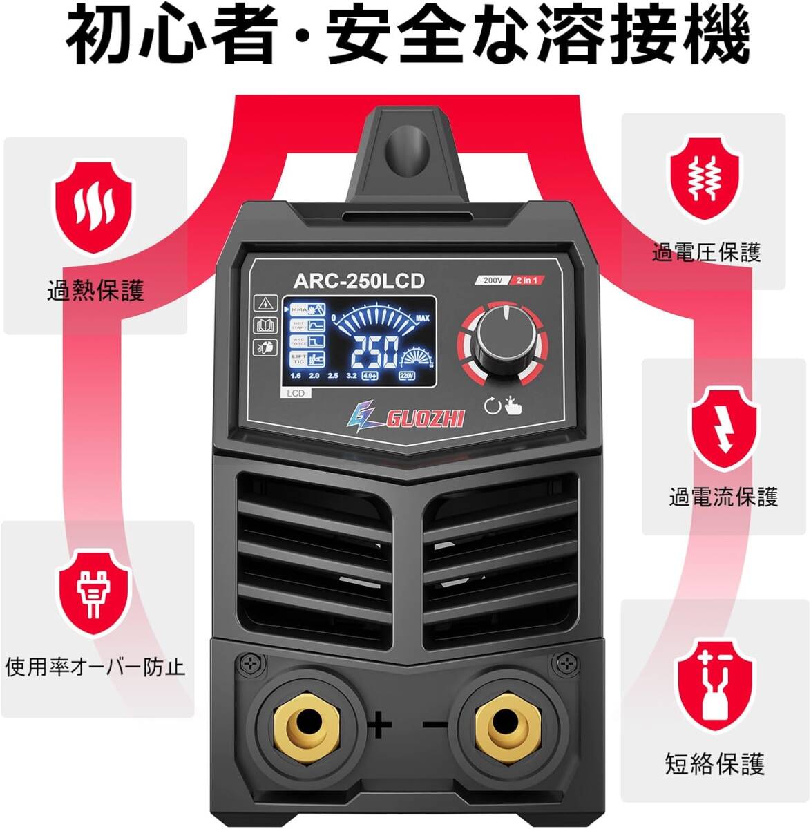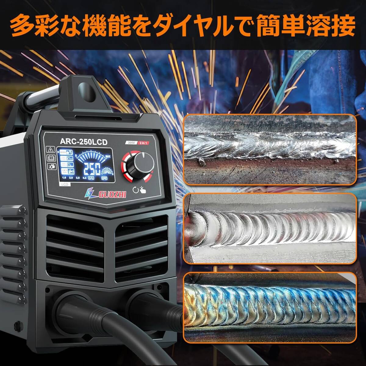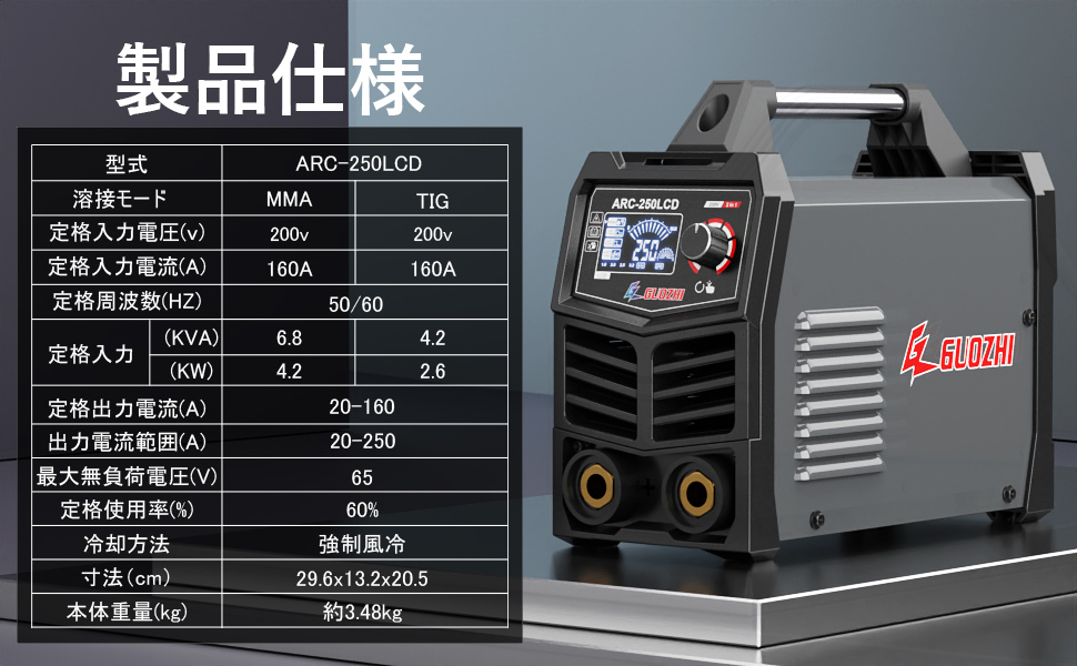 GZ GUOZHI 溶接機 200V 250A 被覆アーク溶接機 インバーター直流 ポータブル 電気 溶接機 定格使用率60% デジタル表示 小型 軽量 家庭用 出張工事 ARC-250LCD