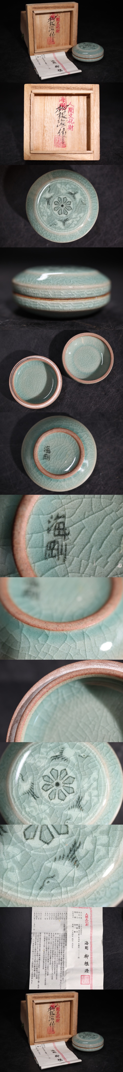 | 柳海剛 ( 柳根瀅 )作 高麗青磁 雲鶴文 白黒象嵌 香合 栞・共箱付 / 名工 人間文化財 香道具 .G2612 |
