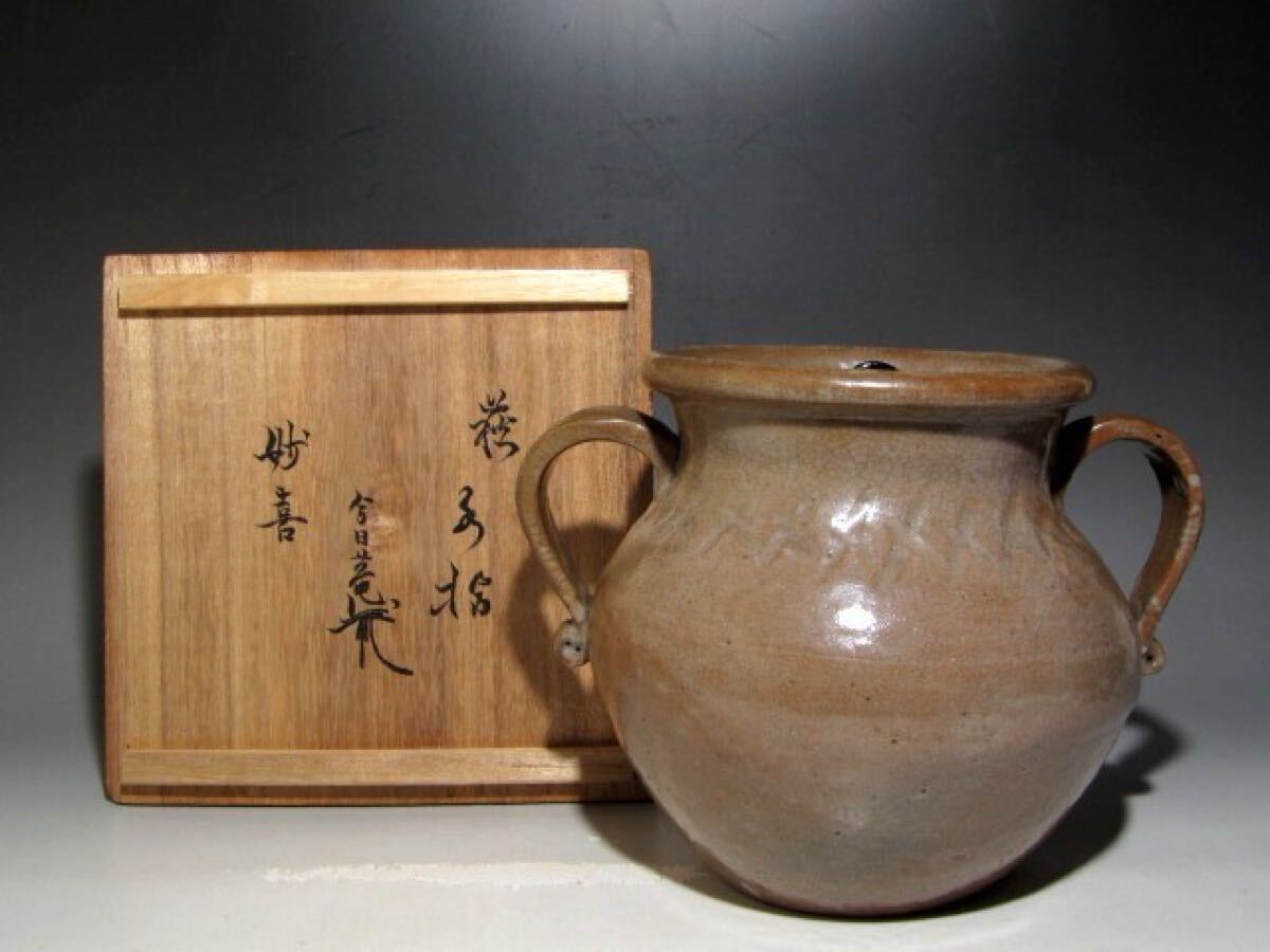 古萩水指「妙喜」です。 時代を感じる逸品です。 箱蓋裏に裏千家八世又玄斎(一燈)の花押がある名品です。 サイズ 直径21cm/高さ16cm(多少の誤差はお許しください) 状態 一見して疵やヒビ・直しは見られません。 骨董品という事をご勘案頂き、時代経過のスレや、小さな傷がある場合があるかもしれませんのでご承知置きください。 | |||
