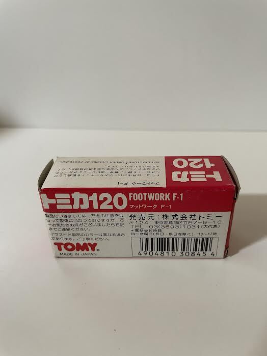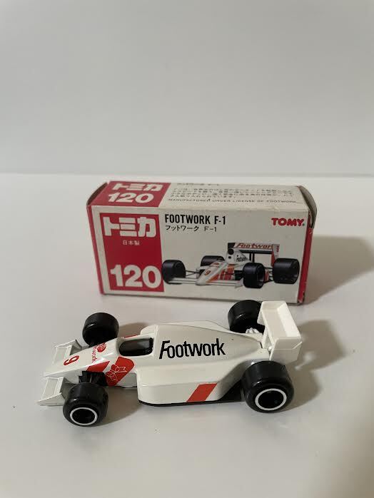 トミカ No.120 フットワーク F-1のミニカーと、そのパッケージである赤箱(日本製)