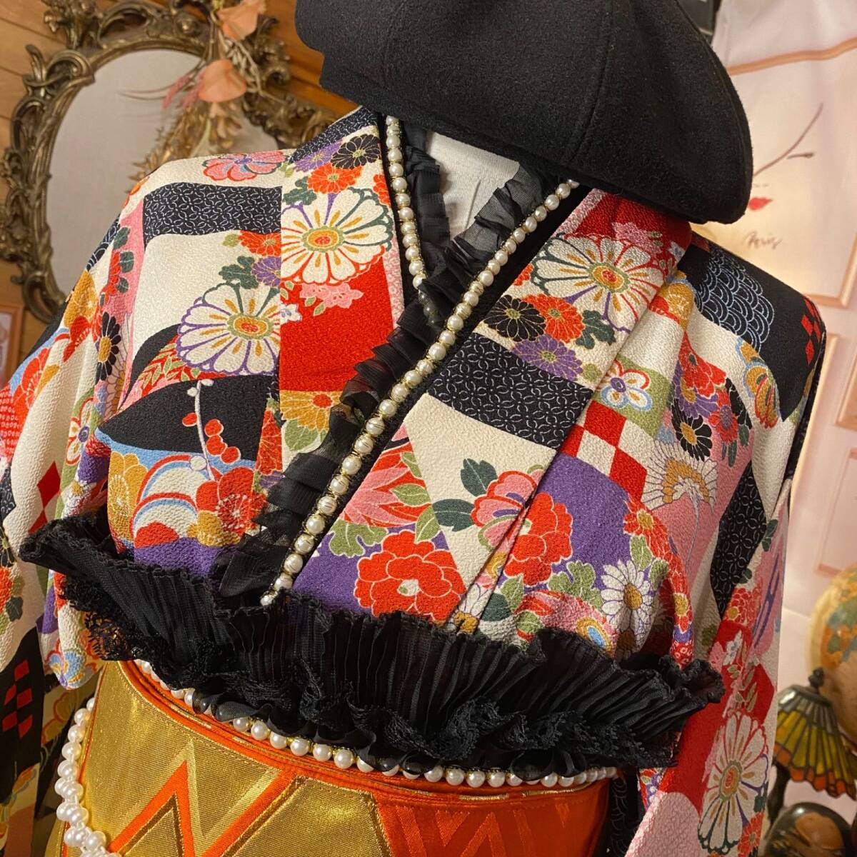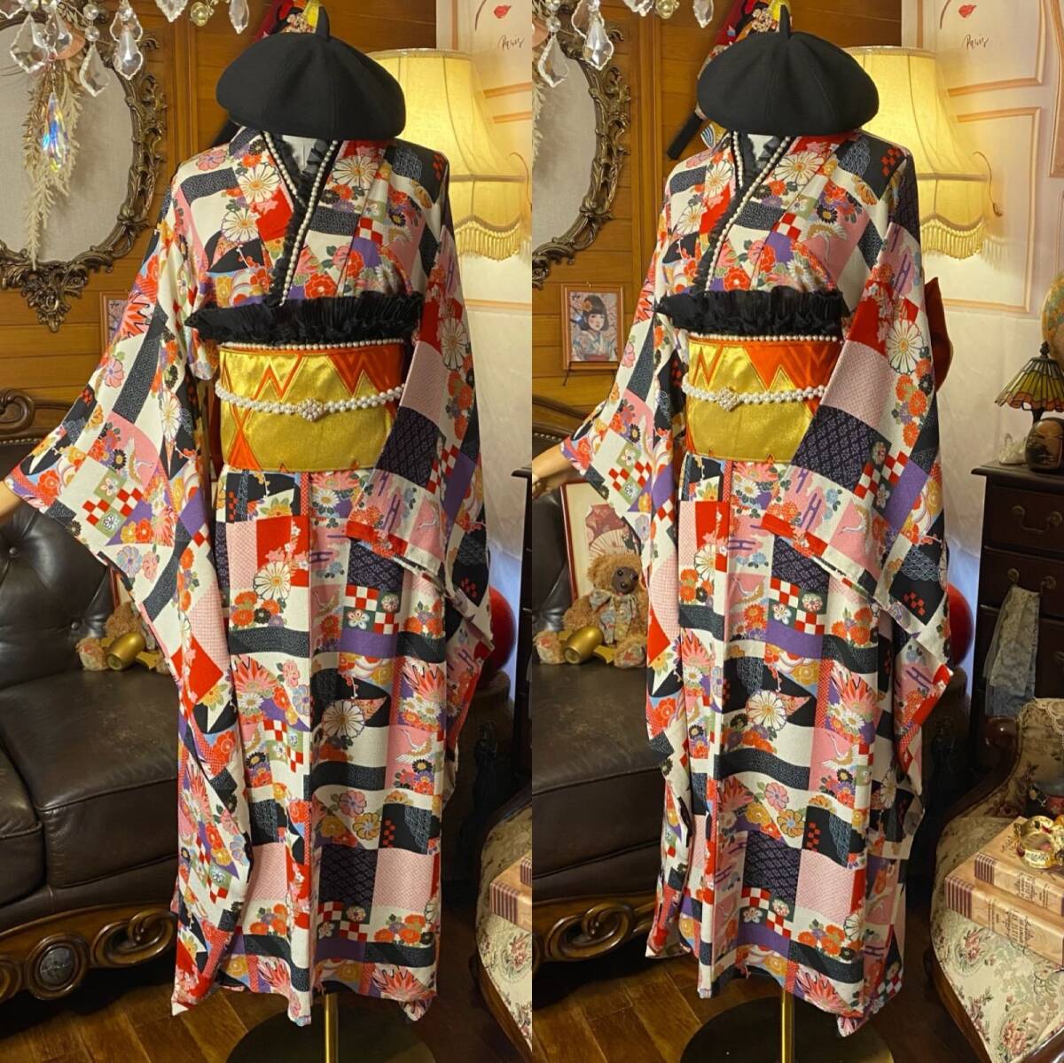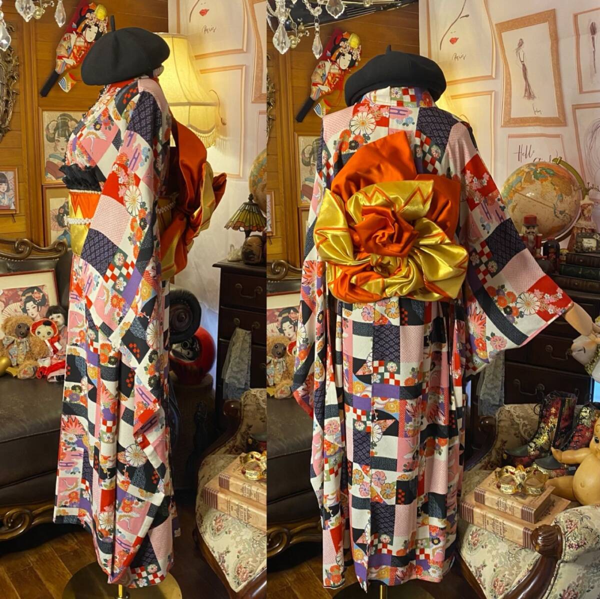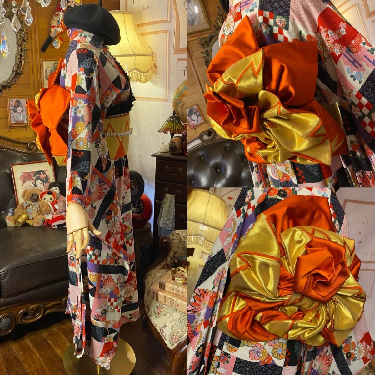 【 単衣振袖 着物 ロングワンピース ドレス 2部式ローズ/バラ作り帯 リメイク 洗える 化繊 パールつけ襟 フリルシフォン帯揚げ 和洋折衷 ハンドメイド レトロ 古着 桜色・朱赤・墨黒・紫・オフ白を基調に、レトロモダンな“パッチワーク風” FKW-30】