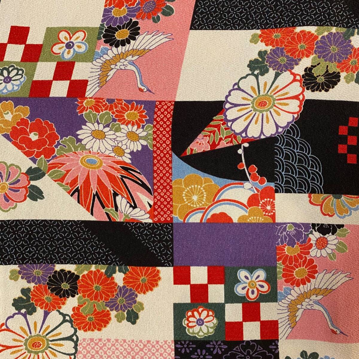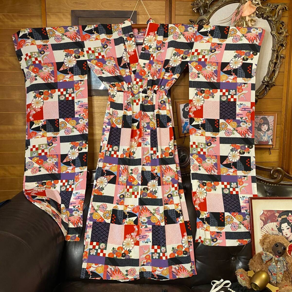 桜色・朱赤・墨黒・紫・オフ白を基調に、レトロモダンな“パッチワーク風”の割付が全身に広がる振袖リメイクワンピース。リズミカルに配した市松文や扇取りに、青海波などの古典文様が重なり、華やかさの中にきちんと感を宿します。