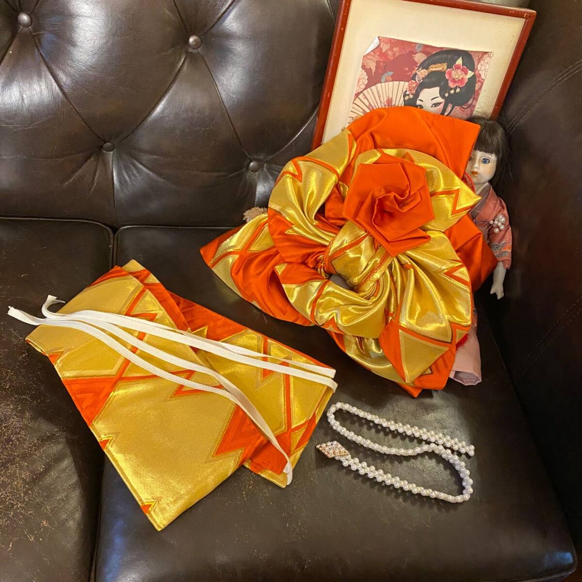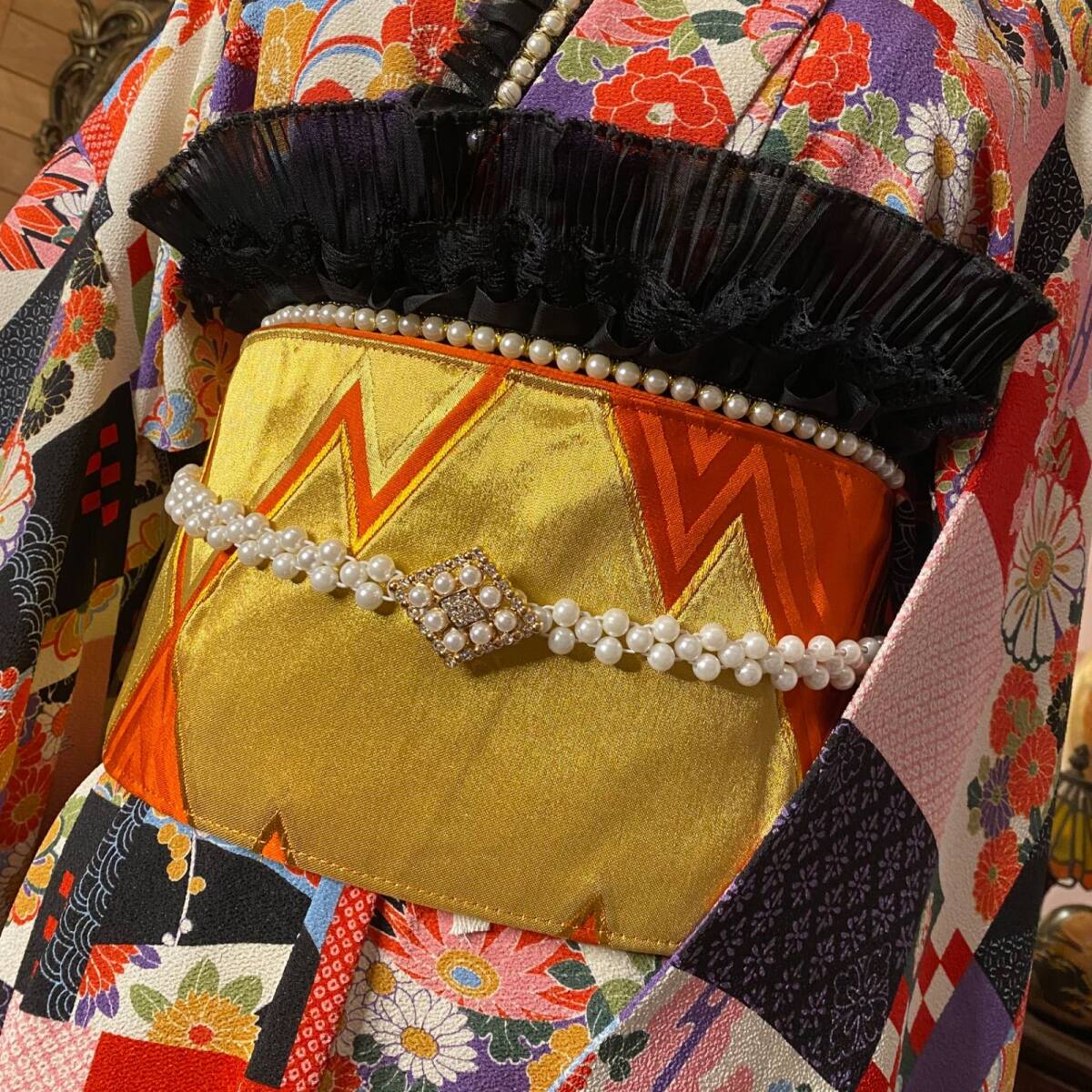 二部式帯は艶やかな山吹金に朱のジグザグ文様で力強く、帯揚げの黒フリル×パールの飾りが甘辛バランスをプラス。背にはオレンジ×ゴールドのローズ風作り帯をふわりと咲かせ、後ろ姿までドラマチックに。