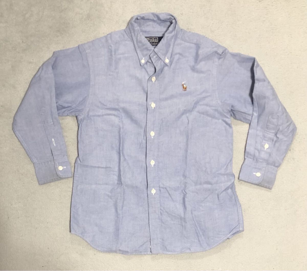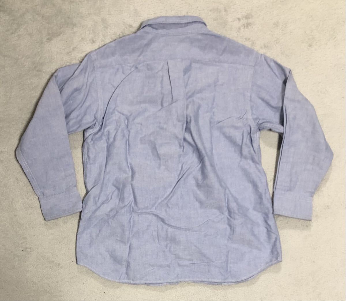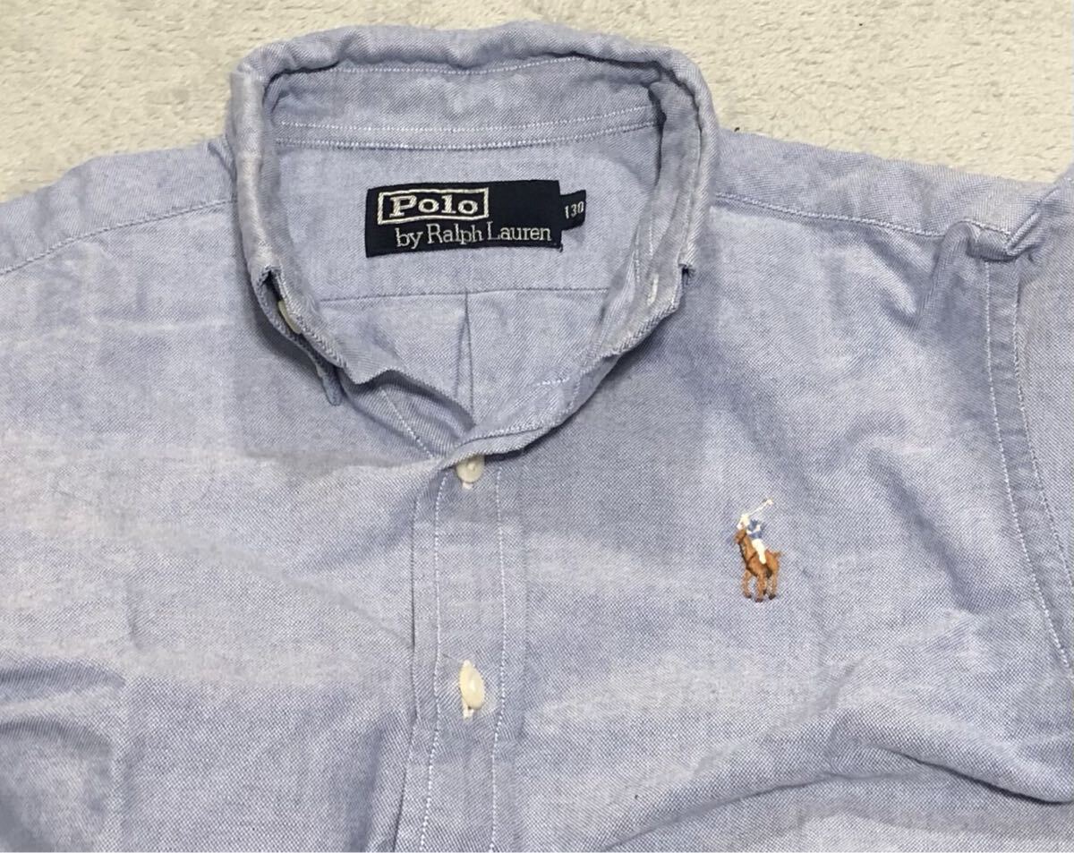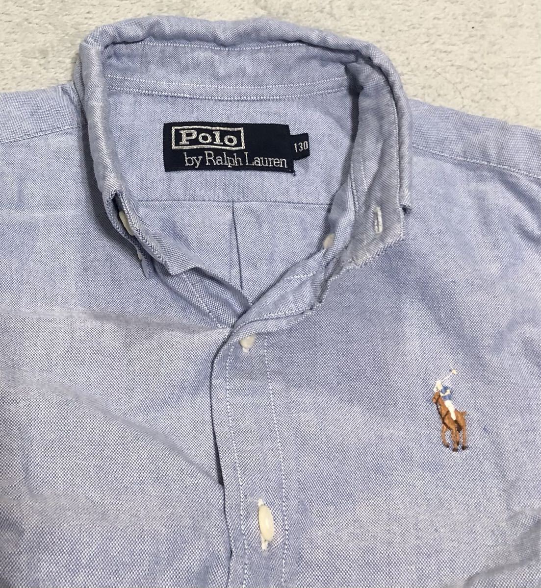 水色の長袖シャツ、刺繍ロゴ付き、130サイズ。