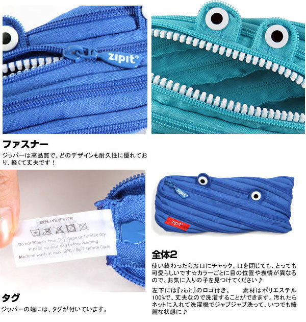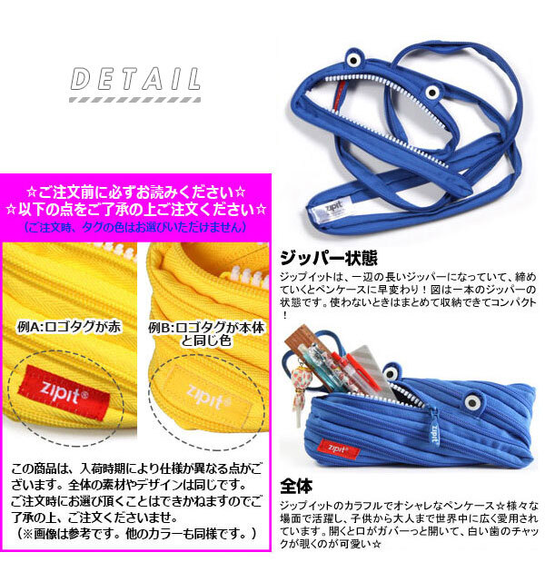 | 商品説明 | 一見すると、ただの長いひも!!ところがジッパーを締めていくと、おしゃれなペンケースに早変わりです♪世界中の人々を虜にしているzipitの魅力はここにあります♪ |