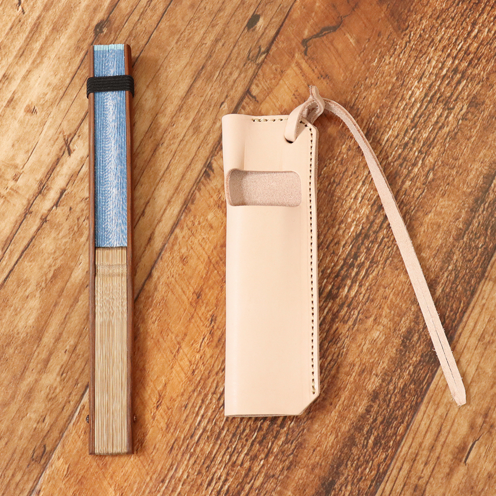 ダメージデニムのような生地を使用した扇子。落ち着いた雰囲気で和装にも普段使いにも合わせやすいデザイン。ヌメ革ケースはストラップでバッグに付けることができます。