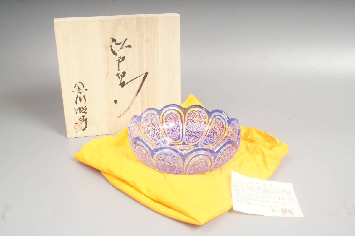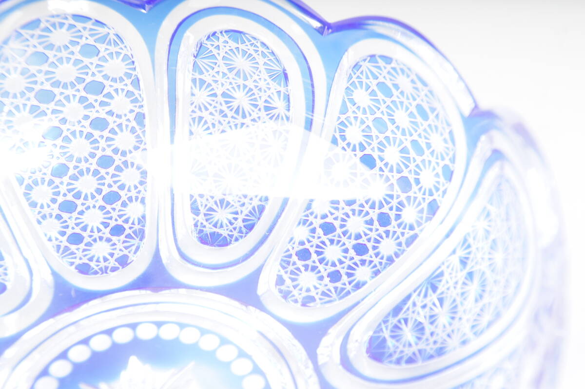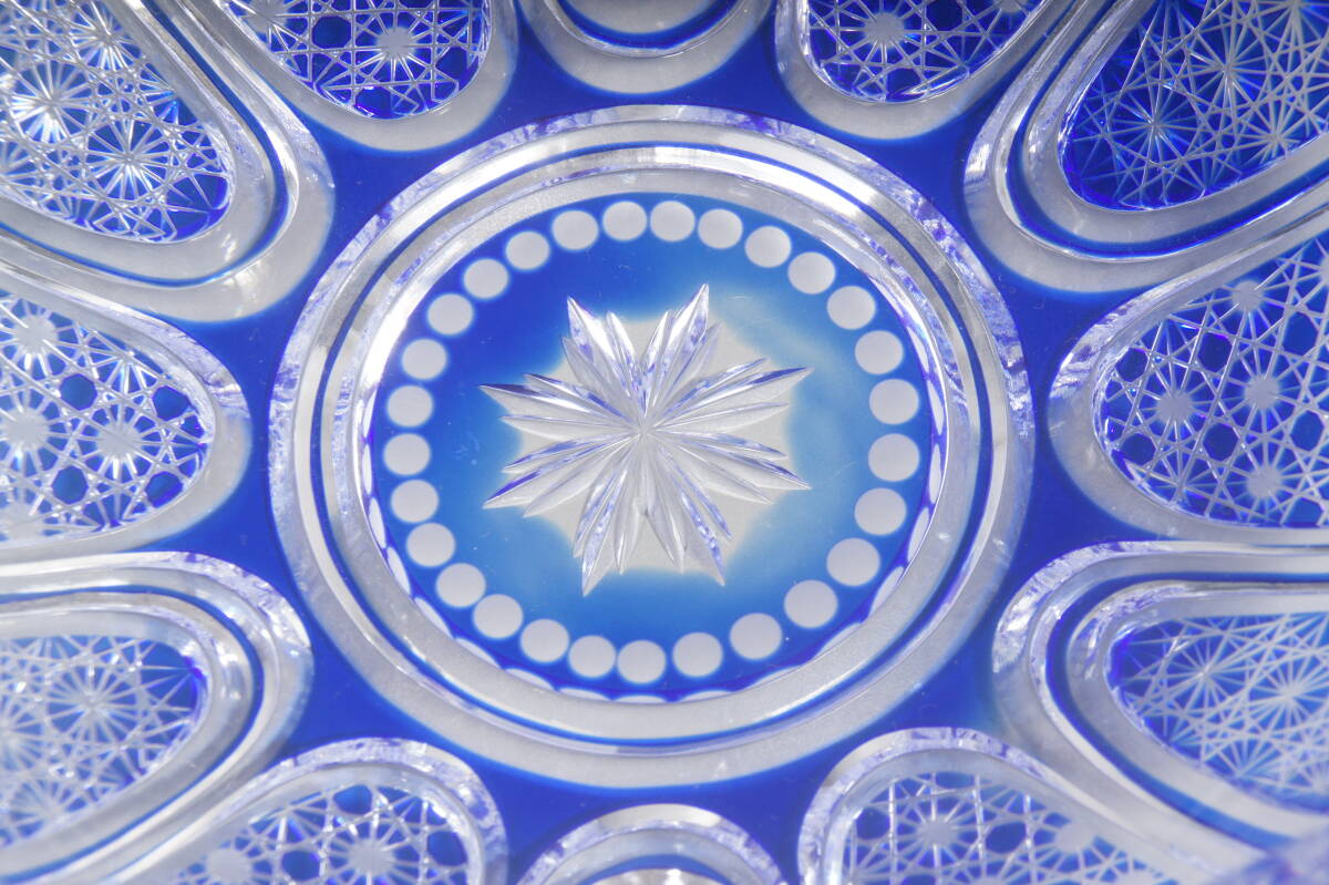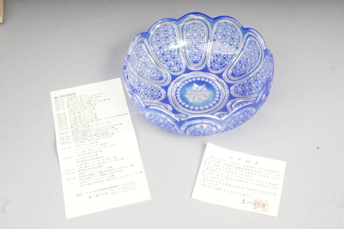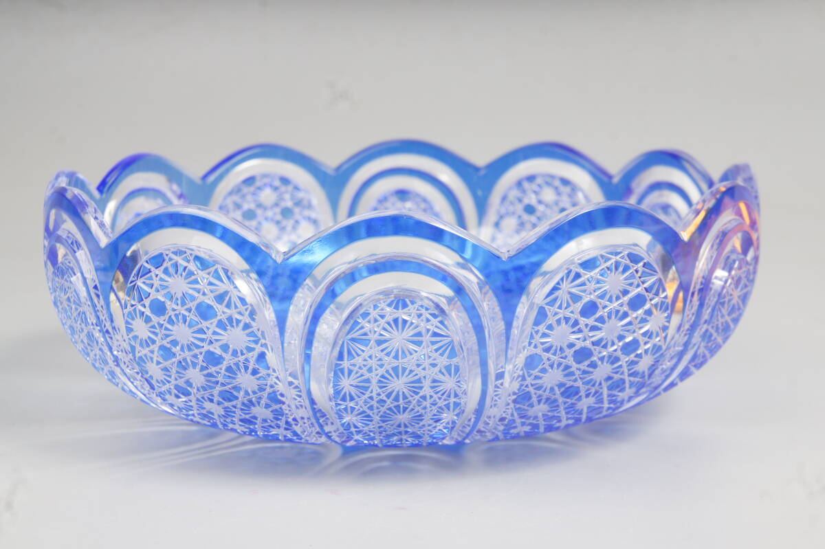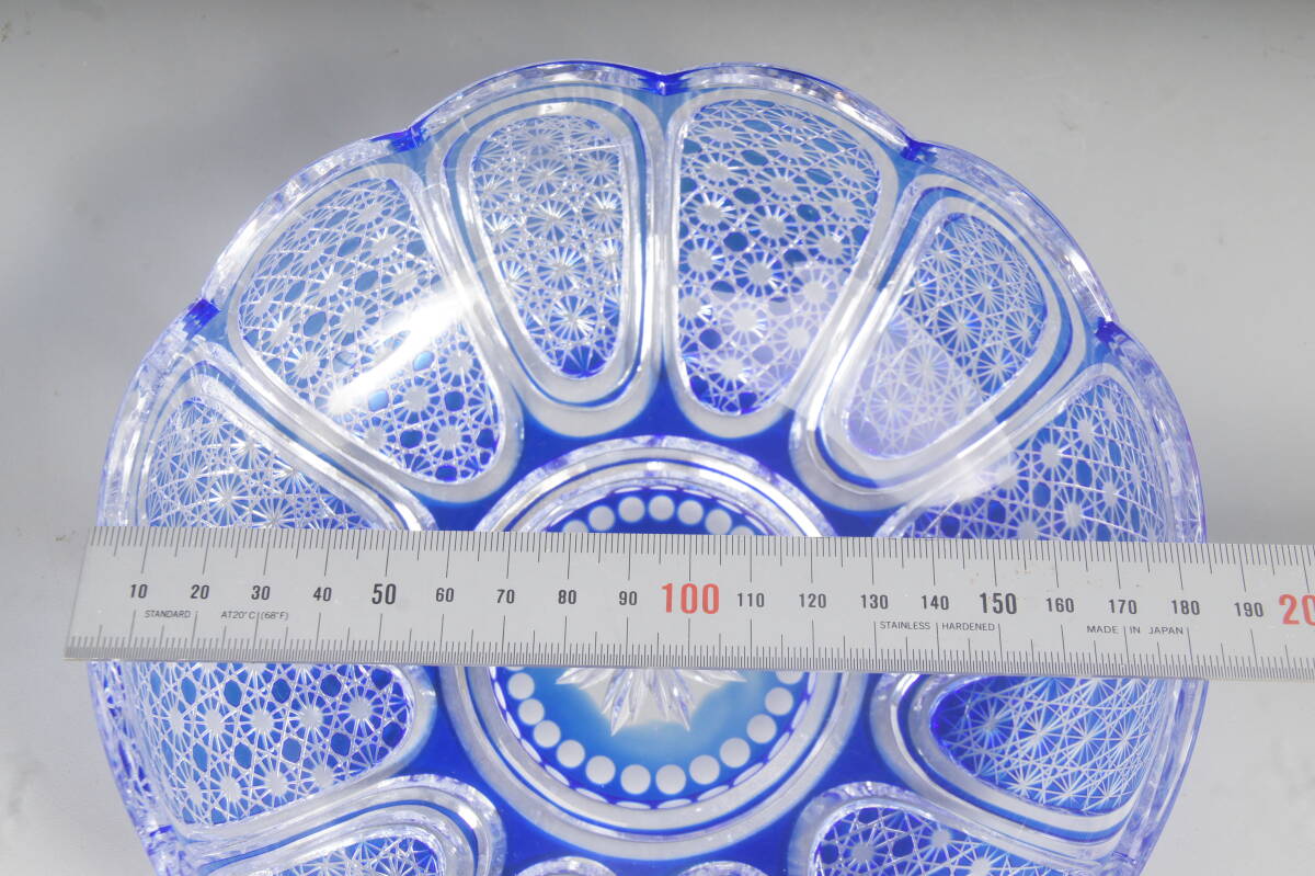 黒川昭男 江戸切子 ルリ色菓子鉢 直径18.5㎝ 共箱入未使用品 ガラスボウル