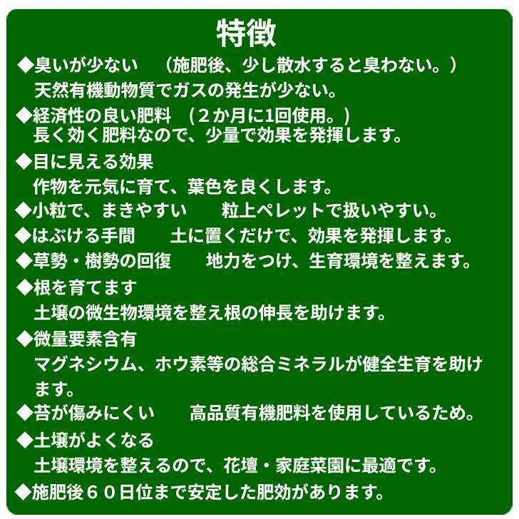 | 商品説明 | ※ 農薬など一切使用していません。 国内産・高品質天然動物有機原料と微量要素及び多様な原料を最適なバランスで配合し、最新の技術を熟練の技で製造された肥料です。 気温15℃以上で施肥後4日から10日位で微生物の活動により白い綿状緒の発生を見ますが酵母菌の働きによるものです。 使う人の身になって考えた画期的な天然動物質有機肥料 ◆臭いが少ない 天然有機動物質でガスの発生が少ない。(施肥後、少し散水すると臭わない。) ◆経済性の良い肥料 長く効く肥料なので、少量で効果を発揮します。(2か月に1回使用。) ◆目に見える効果 作物を元気に育て、葉色を良くします。 ◆小粒で、まきやすい 粒上ペレットで扱いやすい。 ◆はぶける手間 土に置くだけで、効果を発揮します。 ◆草勢・樹勢の回復 地力をつけ、生育環境を整えます。 ◆根を育てます 土壌の微生物環境を整え根の伸長を助けます。 ◆微量要素含有 マグネシウム、ホウ素等の総合ミネラルが健全生育を助けます。 ◆苔が傷みにくい 高品質有機肥料を使用しているため。 ◆土壌がよくなる 土壌環境を整えるので、花壇・家庭菜園に最適です。 ◆施肥後60日位まで安定した肥効があります。 施肥時期 植物の「発芽後1階」「開花後1回」「8月中旬から9月上旬1回」年3回くらい使用する。 |