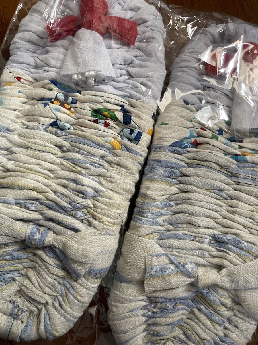 リサイクルの布を使用しての手作りですので左右の大きさ・デザインに若干の差異がある場合がありますのでご了承ください。