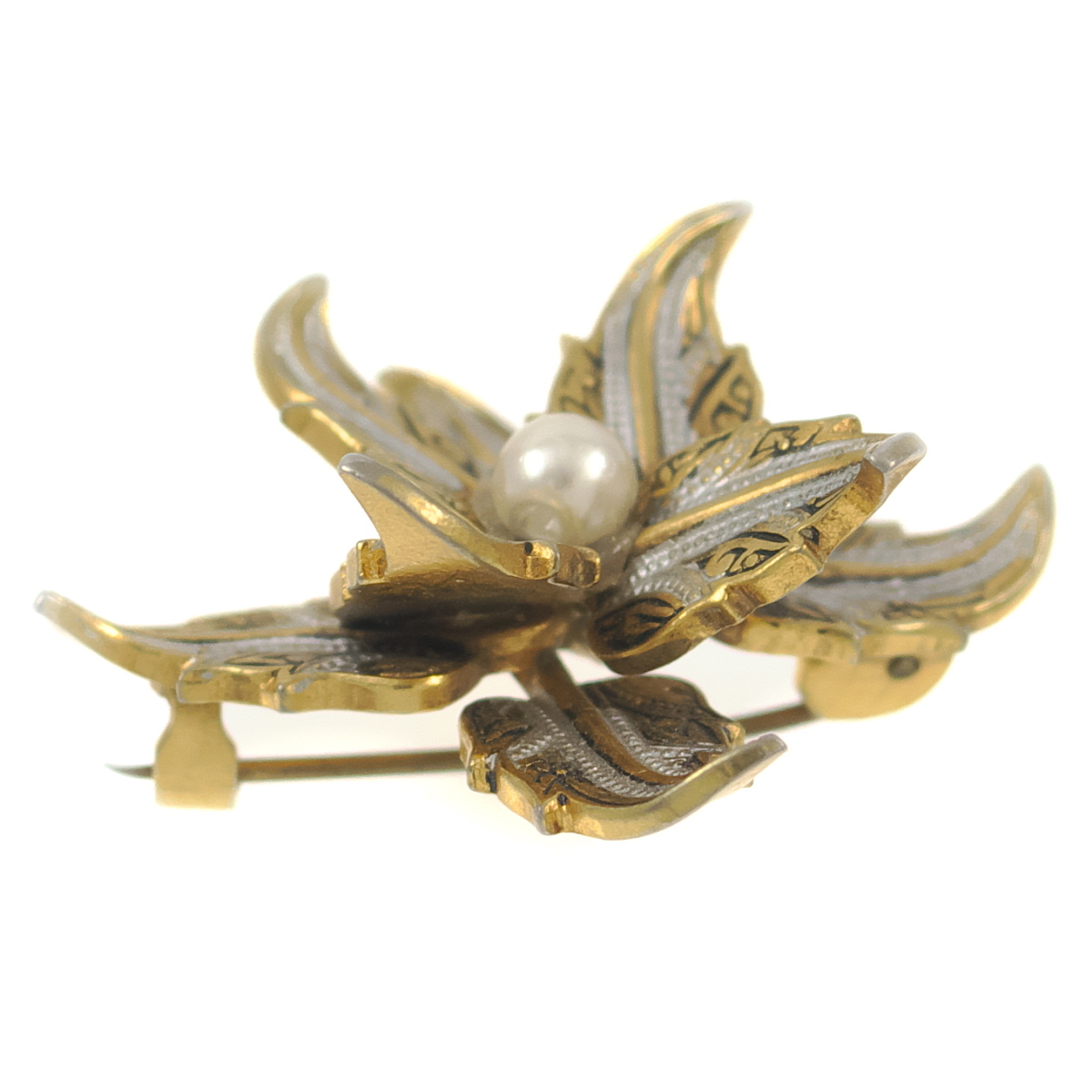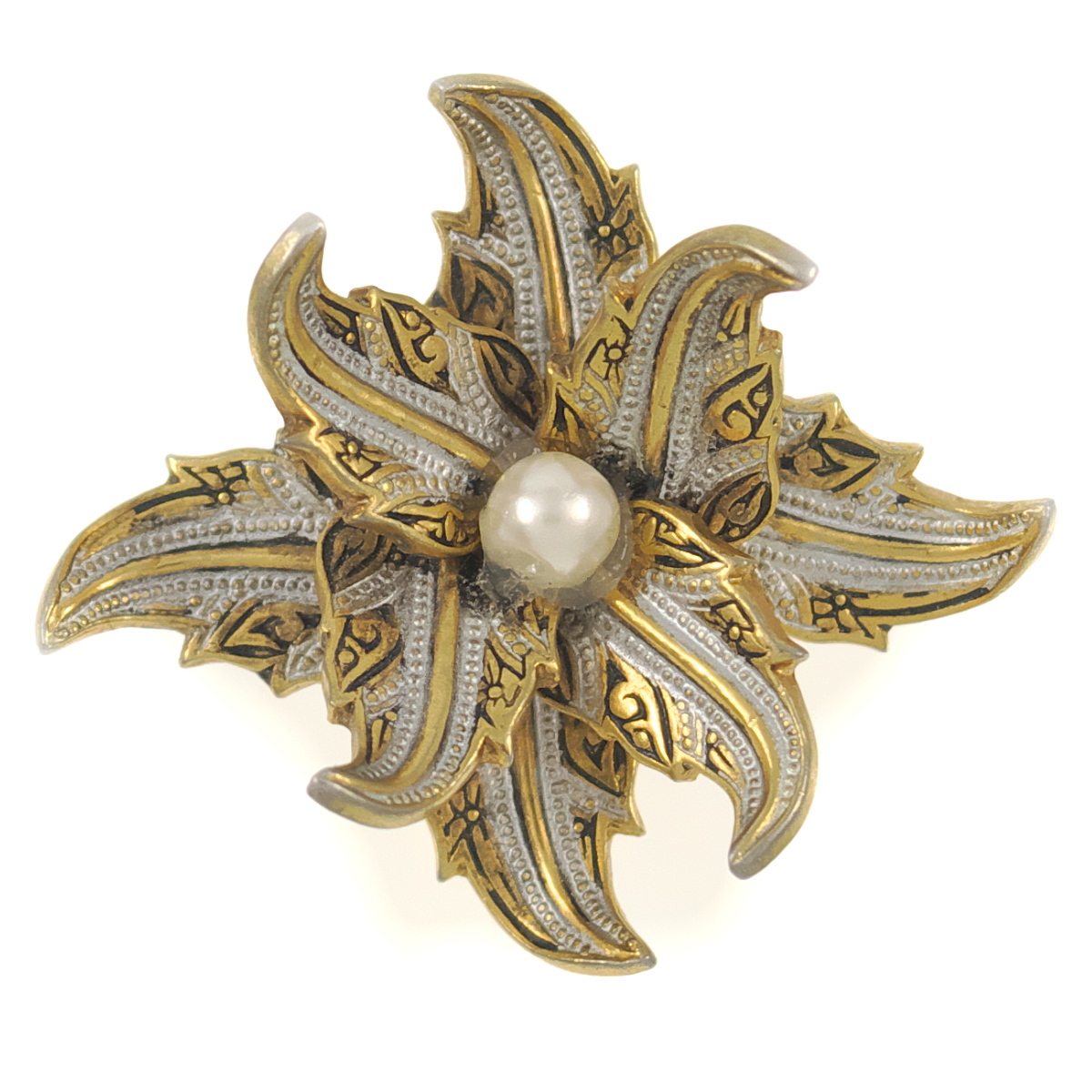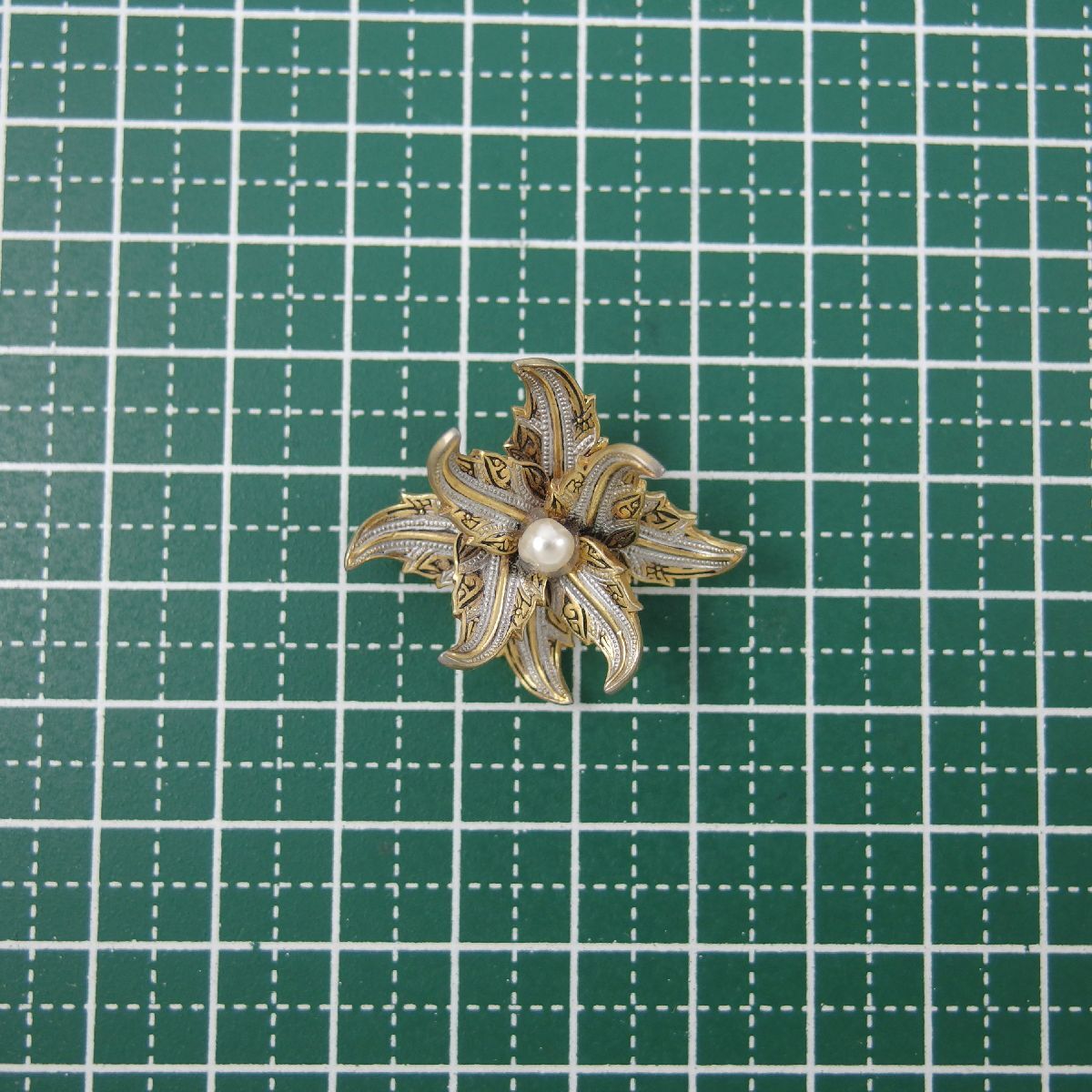 UK4086◆ フラワーモチーフ 象嵌 ダマスクスタイル 花 フェイクパール ヴィンテージブローチ ◆
