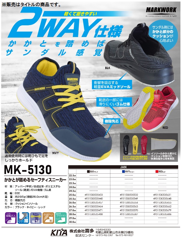 喜多 KITAかかとが踏めるセーフティスニーカーMK5130 MARK WORKカラー:ブラック※販売はタイトルの商品です。通常の靴として使用できる他、かかとを踏めばサンダル感覚で履ける2WAY仕様。樹脂先芯入りで軽量なセーフティスニーカーです。■特長・かかとが踏めるセーフティスニーカー・サンダルの時にはかかと部分のクッションが心地よい・衝撃を吸収する軽量EVAミッドソール・靴底の一部には滑りにくいゴム仕様・通常時には靴紐で足をしっかりホールド■素材・アッパー(甲革):合成皮革/ポリエステル・ソール(靴底):EVA樹脂/ゴム・靴幅:EEE・先芯:樹脂先芯・仕様:クッションインソール