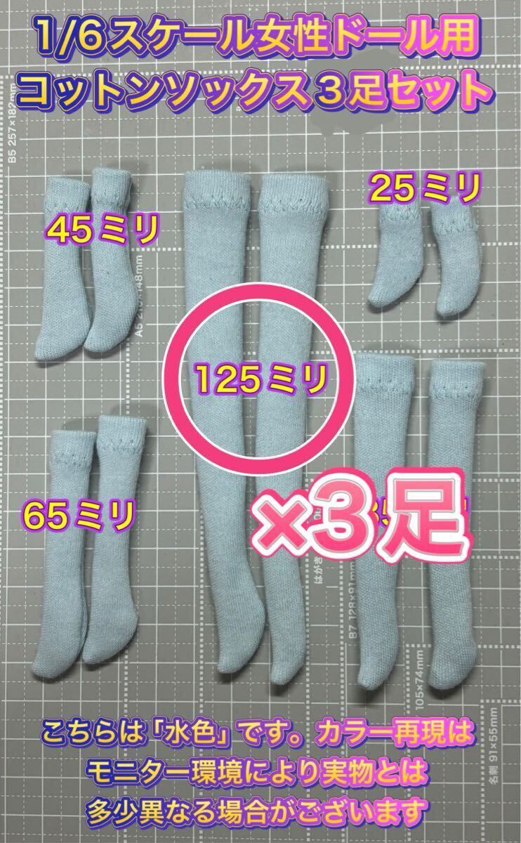 リカちゃん、ジェニー、ネオブライス、アイシードール 、オビツ27女性ボディ、ハッシュタグボディなどが着用出来る、ごくシンプルな綿のソックス長さ違い、平置きで約125ミリの3足セットです。