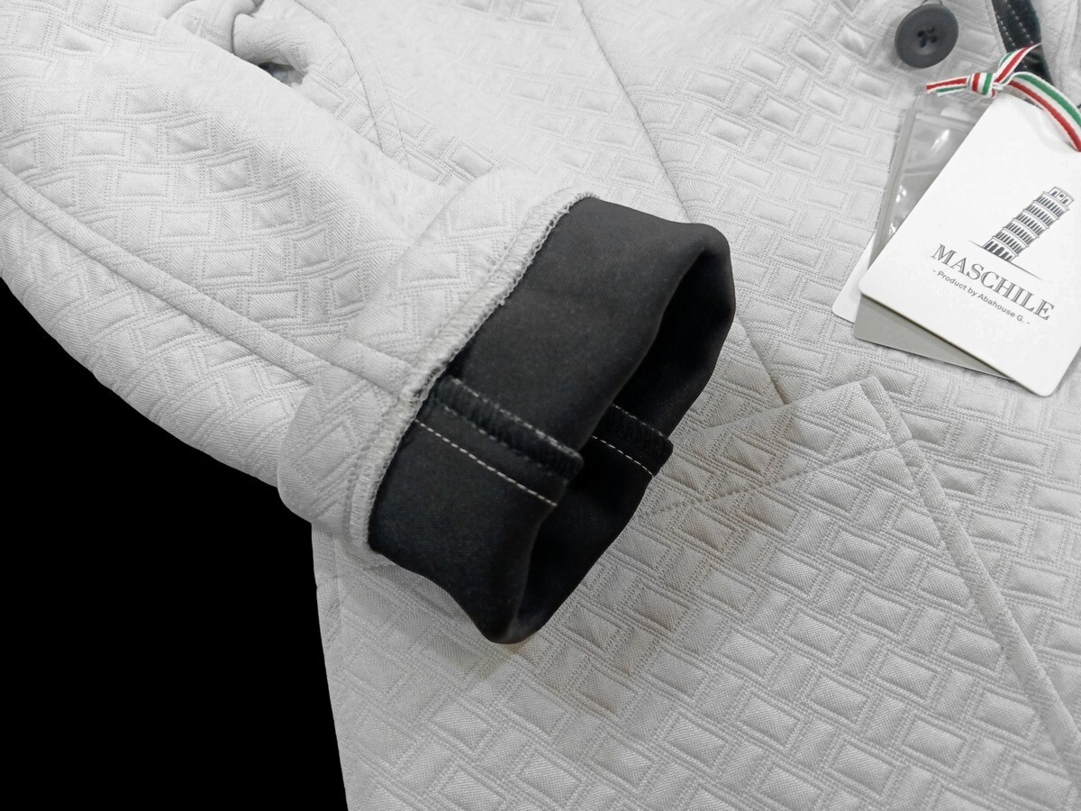 ●しっかりした肉感のポンチ生地に、凹凸がある3Dジャガード素材をボンディングしたセットアップスーツです。