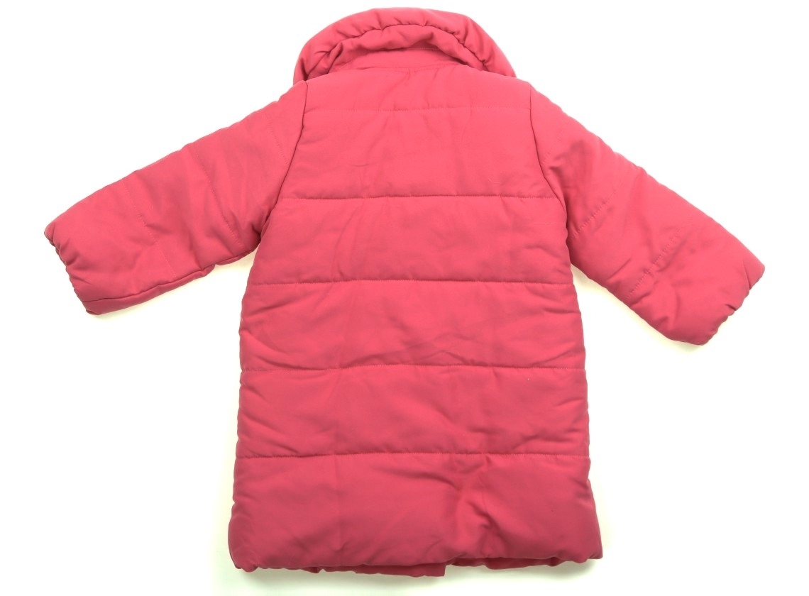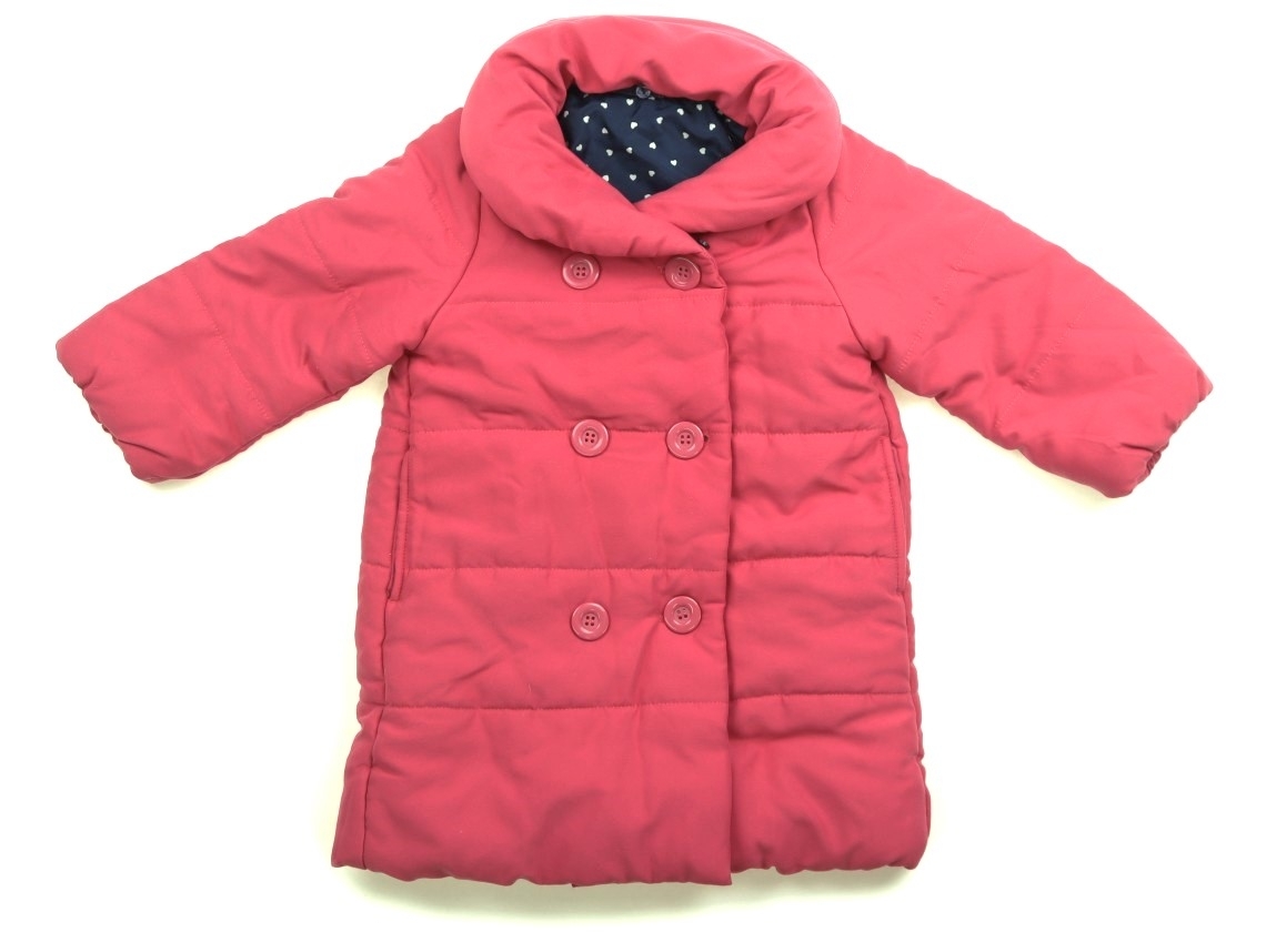ポリエステル素材。中綿入り。実際のサイズ表記は、90-100。襟の付属品が欠損しています。前ボタン開き。所々に糸つれあり。毛羽立ち・洗いざらし感があります。