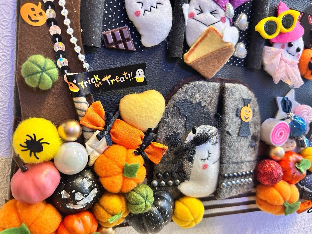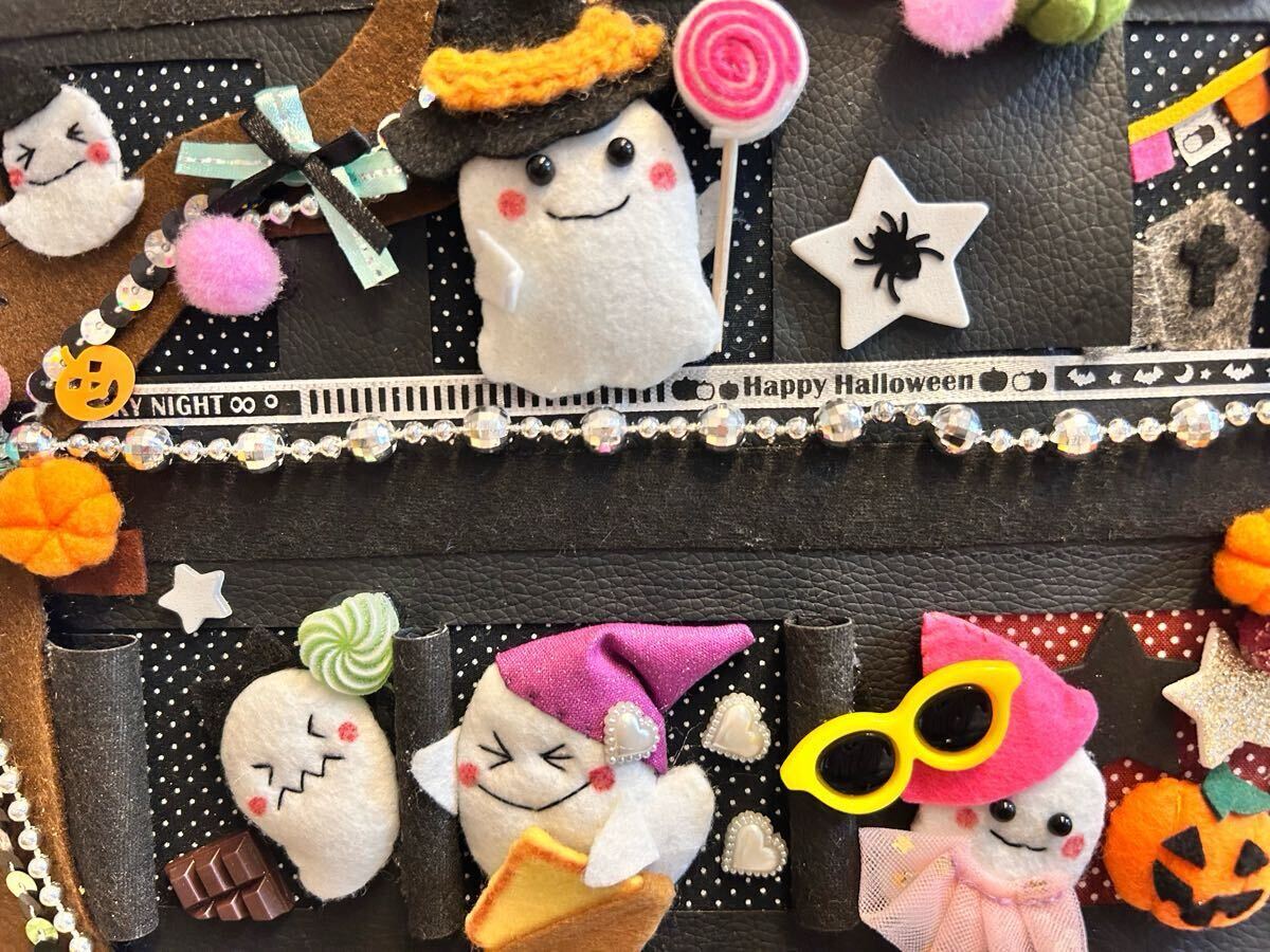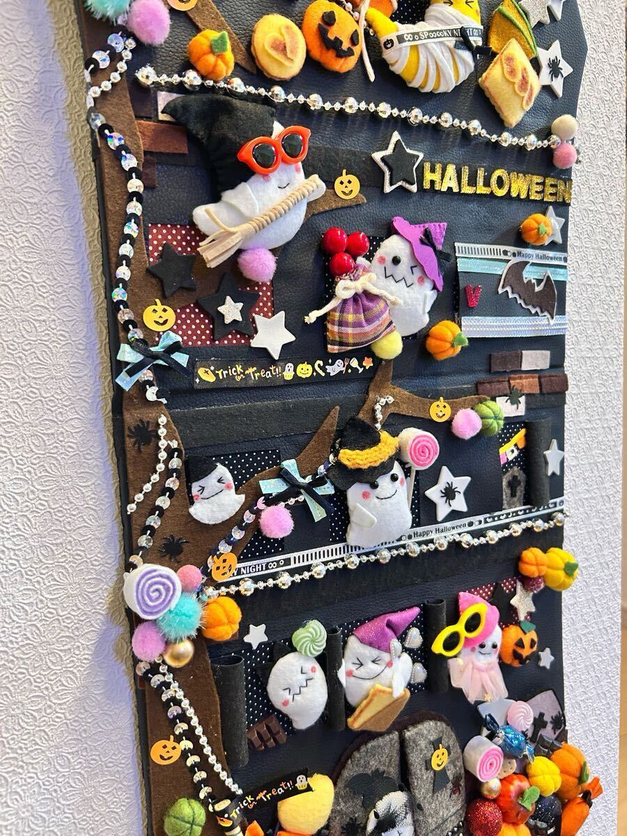 ハロウィンの壁飾りをフェルトや厚紙、スチレンボードなどを使用しておばけちゃんやかぼちゃ、キャンディー、クッキーなどをいっぱい作って飾りました♪