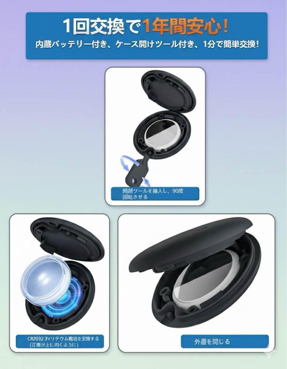 【進化版】大切なものを守る、さらに進化したスタイリッシュなトラッカー!長いバッテリー寿命: AirTagは交換可能なバッテリーを搭載しており、通常の使用で約1年間持続します。これにより、頻繁な交換の手間を省き、長期間にわたって信頼性を維持することができます。