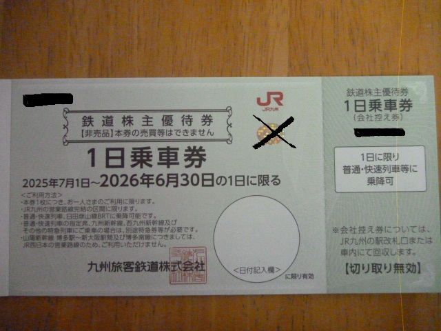 ・JR九州鉄道株主優待券  1日乗車券 2枚綴り(2025年7月1日~2026年6月30日まで)