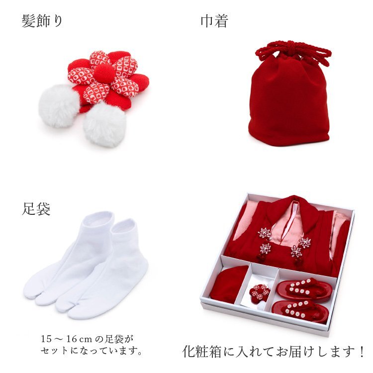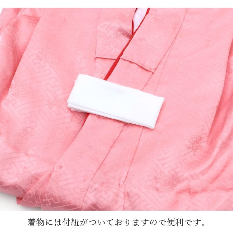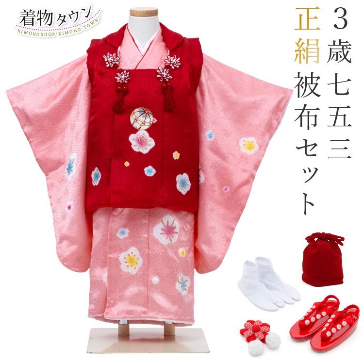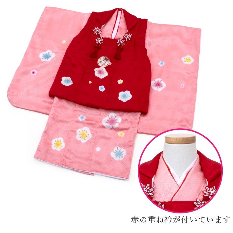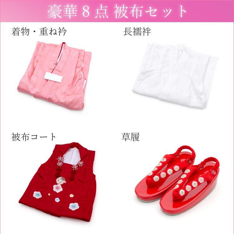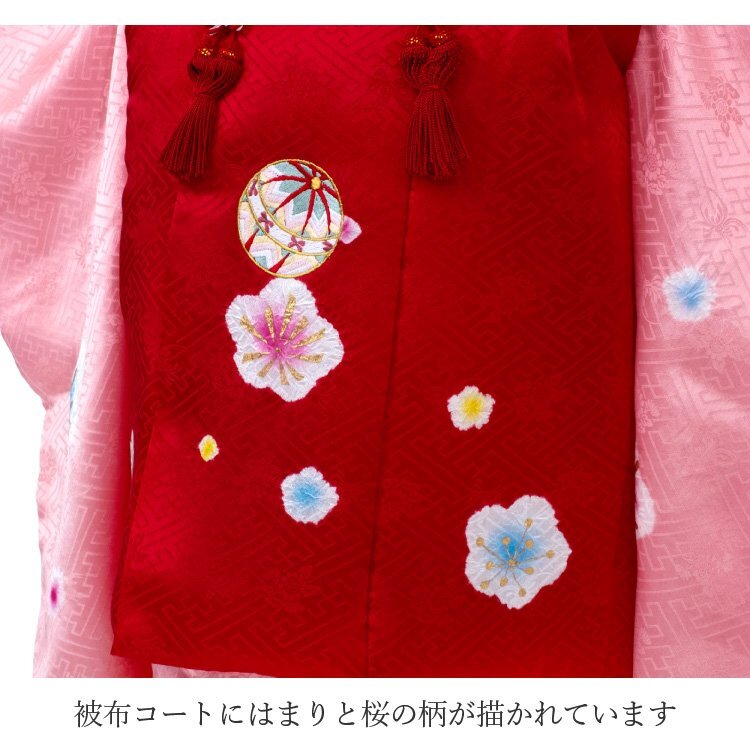 商品説明 | 地模様入りの生地でピンクのお着物に赤色の被布コートを合わせた七五三3歳用の被布着物フルセットです。 御祝着に最適な賑やかな柄になります。 肩揚げと腰揚げもしてあり、お子様の体型にもよりますが身長95cm前後であればお直しなしで着用していただけます。 着用はお着物に紐が付いていますので便利です。 |