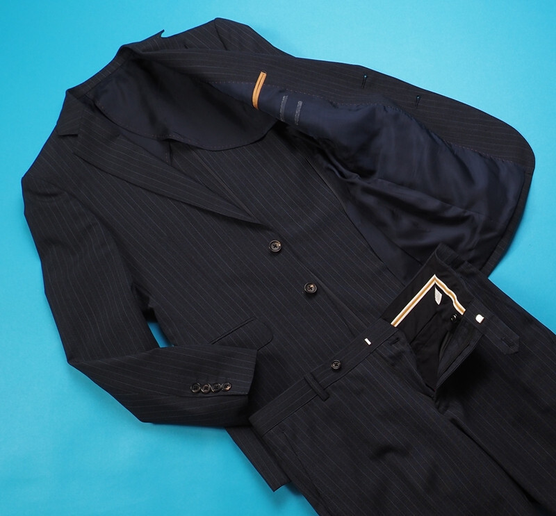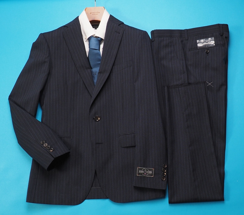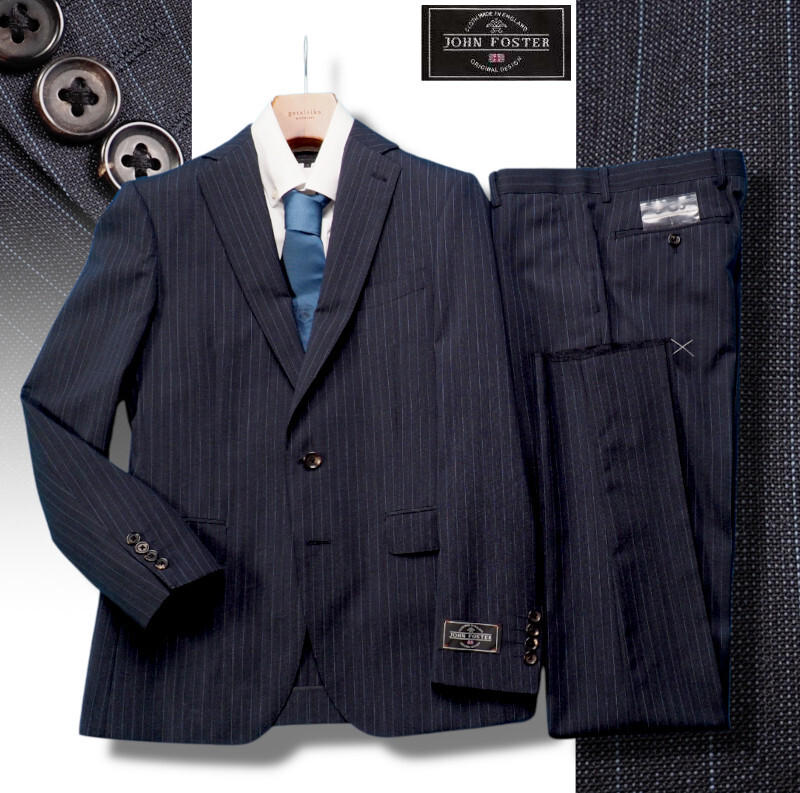 新品訳8.6万円 大手百貨店扱い 春夏『ジョンフォスター 英国製生地』 ウール100% ストライプ スーツAB6紺(B) 1512071