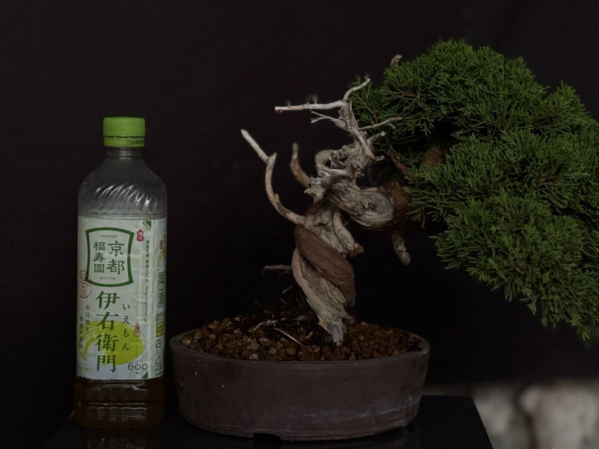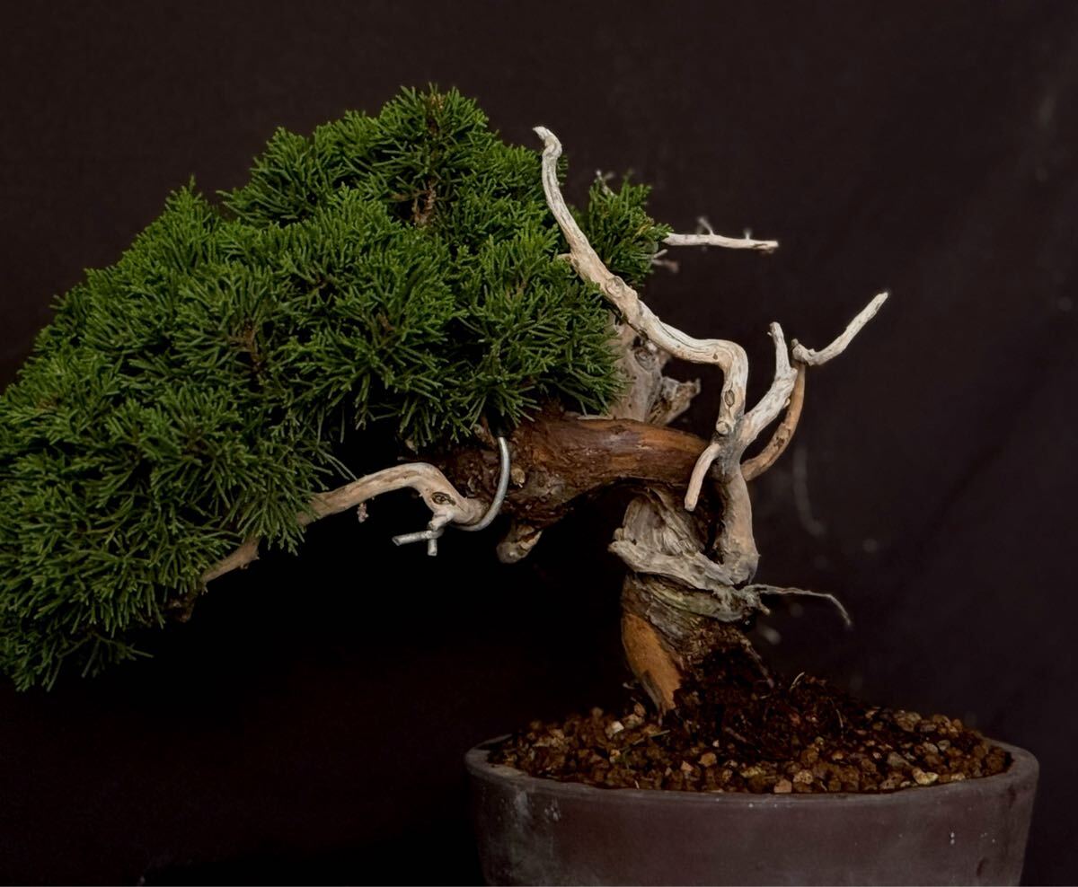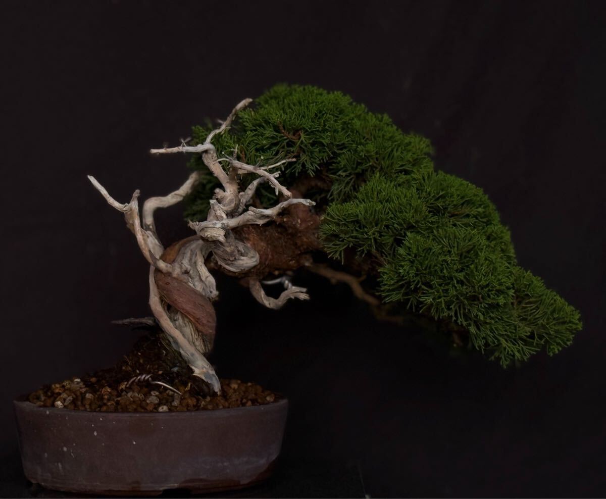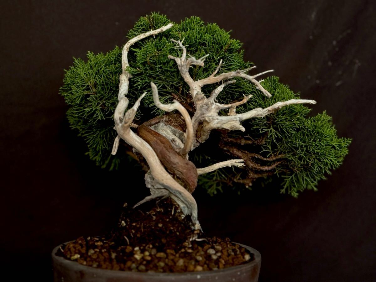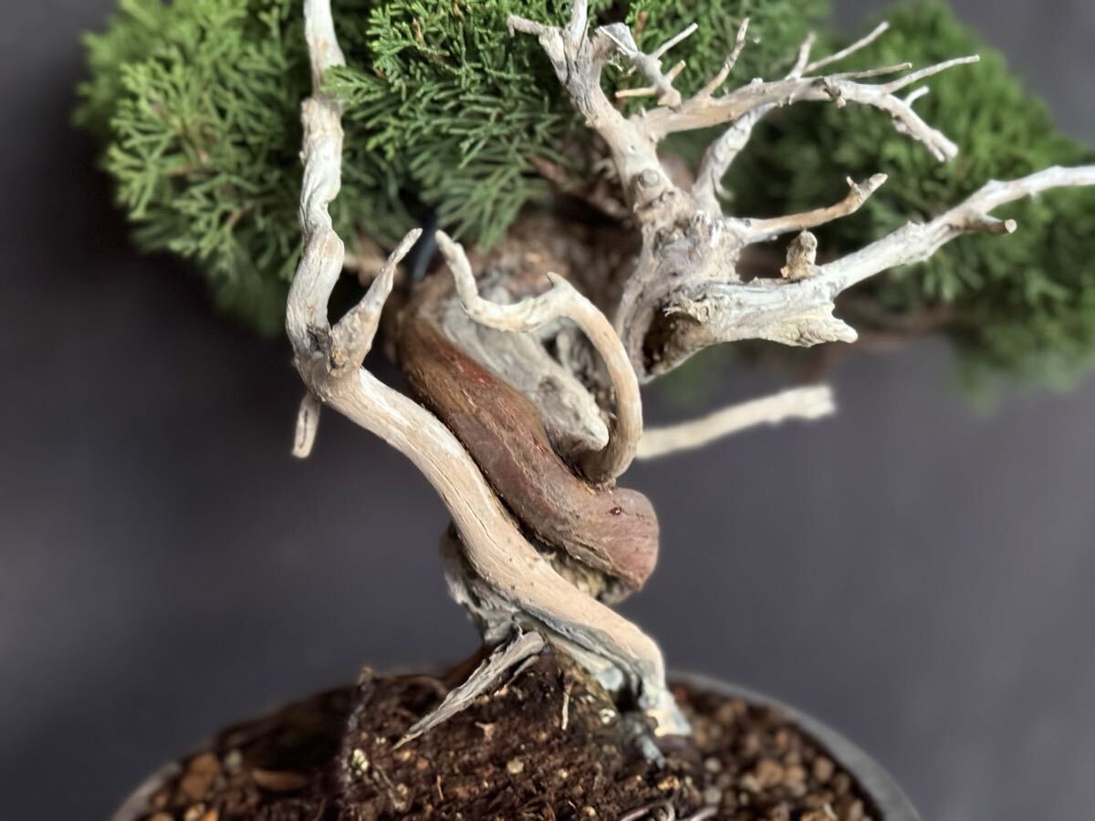 捻れるような幹模様、そして赤褐色の肌幹と鮮やかな緑色の葉、白く年月を感じさせるシャリやジンが特徴です。