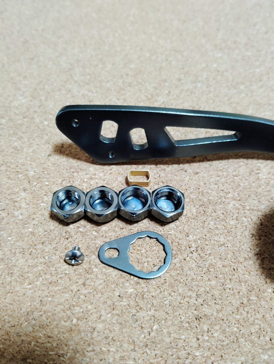 ハンドルは写真にあるようにわずかにクランクしています。機種によってはドラグと干渉する場合があります。またハンドル取り付け部分のシャフトが機種によっては長い場合があり、ナットはオープンタイプではなく袋ナットなので、締め付けきれない場合もございます。
