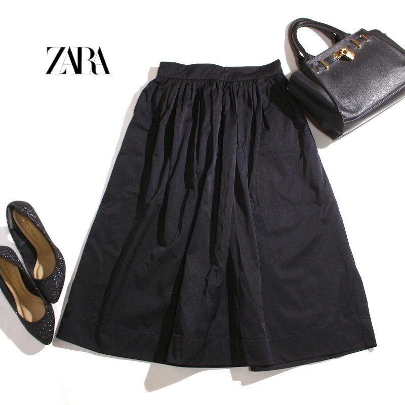 美品 ZARA woman ザラ ウーマン 合物 ハリ ほんのり艶 ミディ ロング丈 ギャザー フレアスカート XS ブラック 定番 通年 秋 シンプル 無地