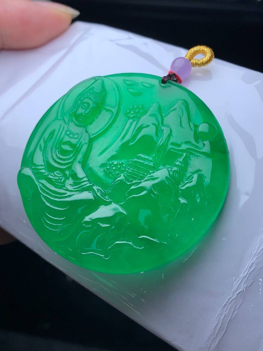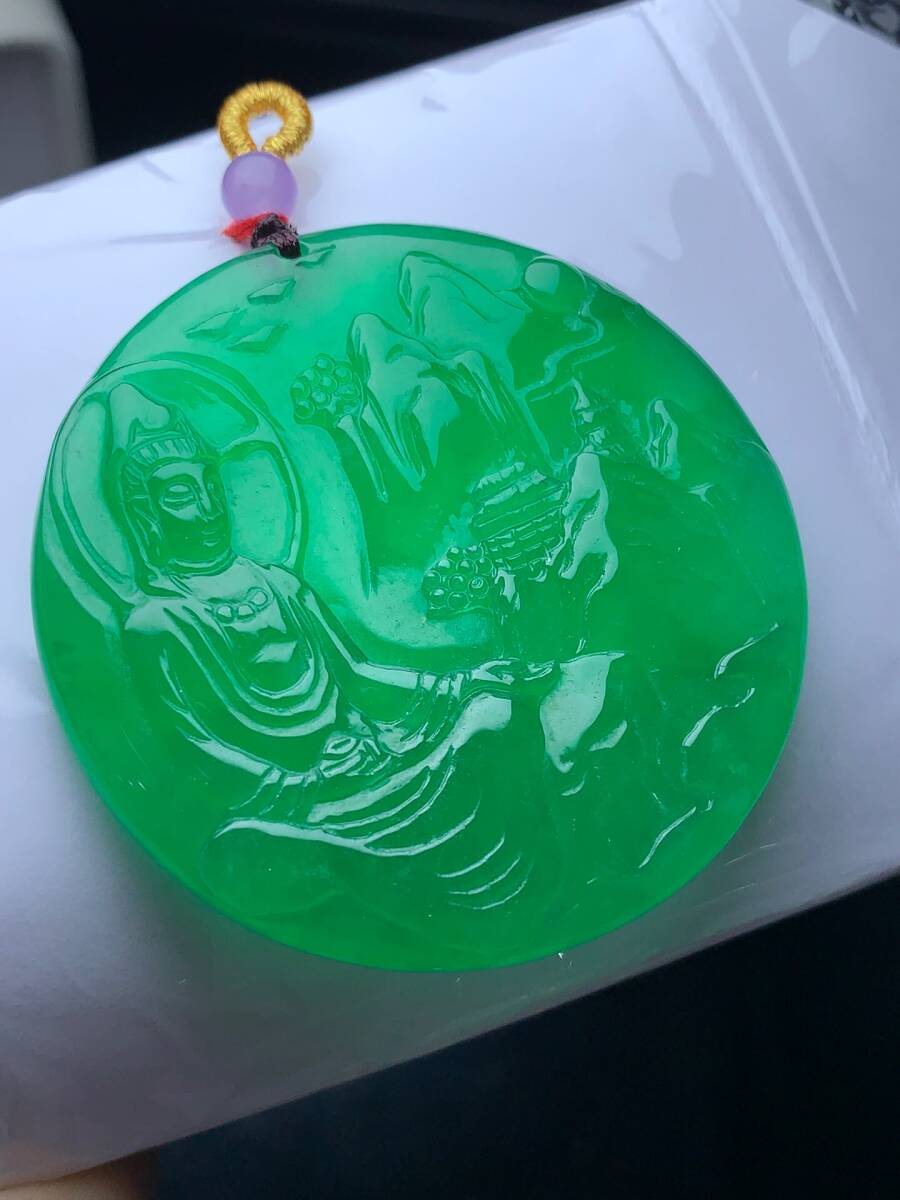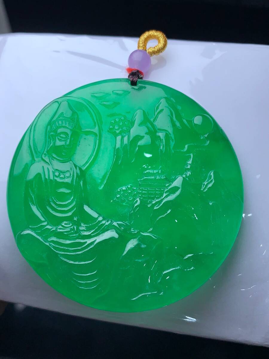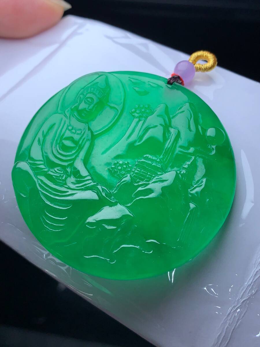 ▽鴻▽ 翡翠製 細密彫 山水觀音ペンダント 根付 裝身具 古賞物 古董品 時代物 稀少珍品 中国古玩 中国古美術