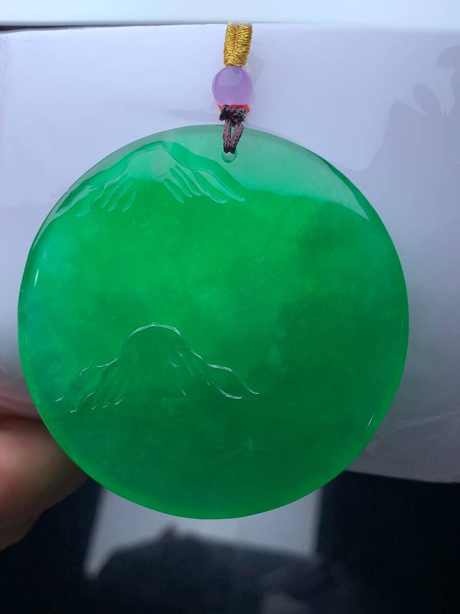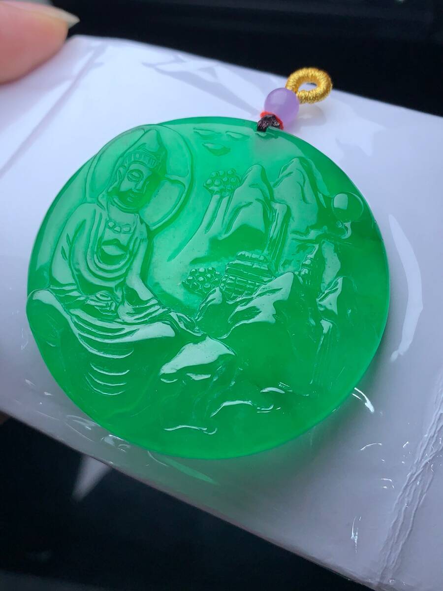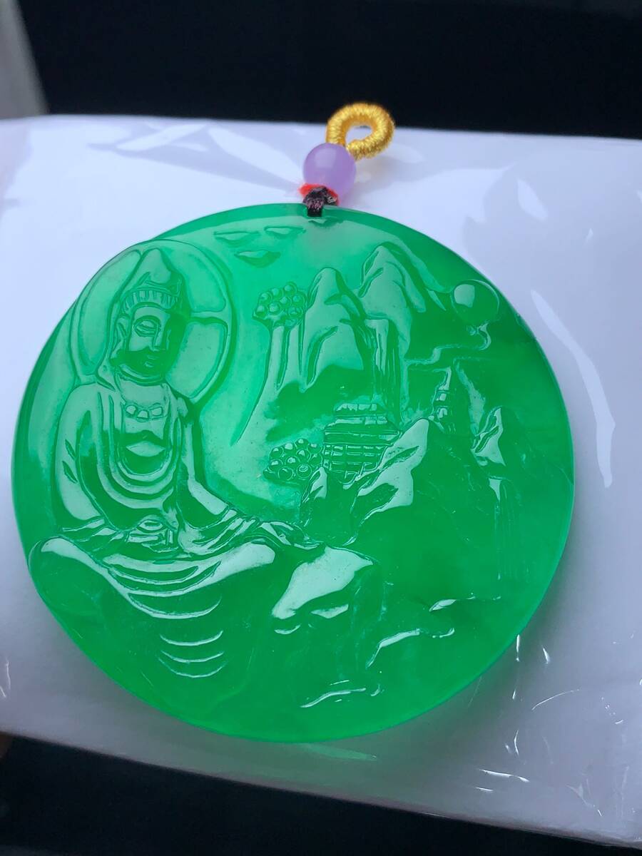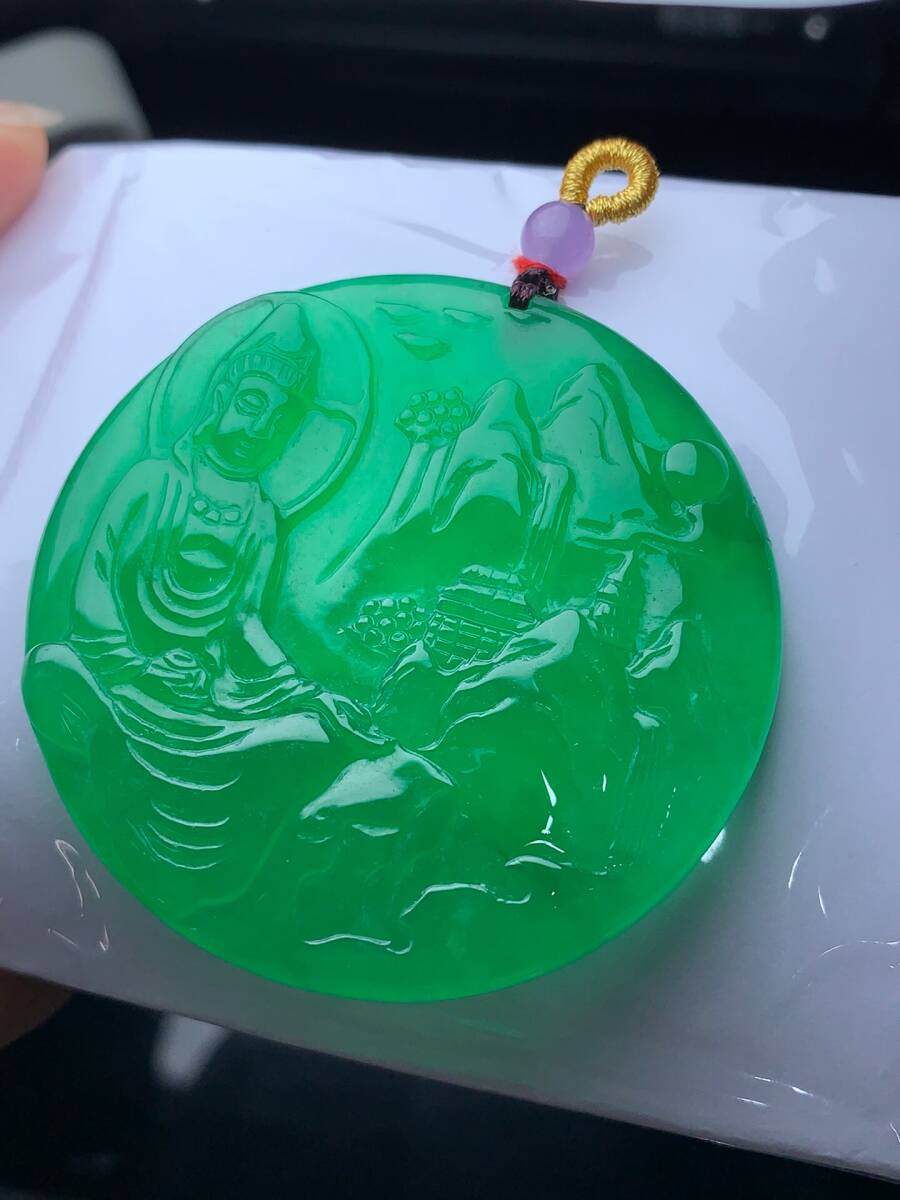 ▽鴻▽ 翡翠製 細密彫 山水觀音ペンダント 根付 裝身具 古賞物 古董品 時代物 稀少珍品 中国古玩 中国古美術