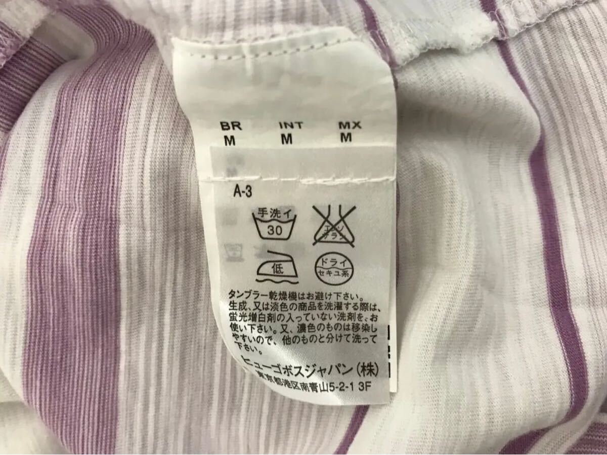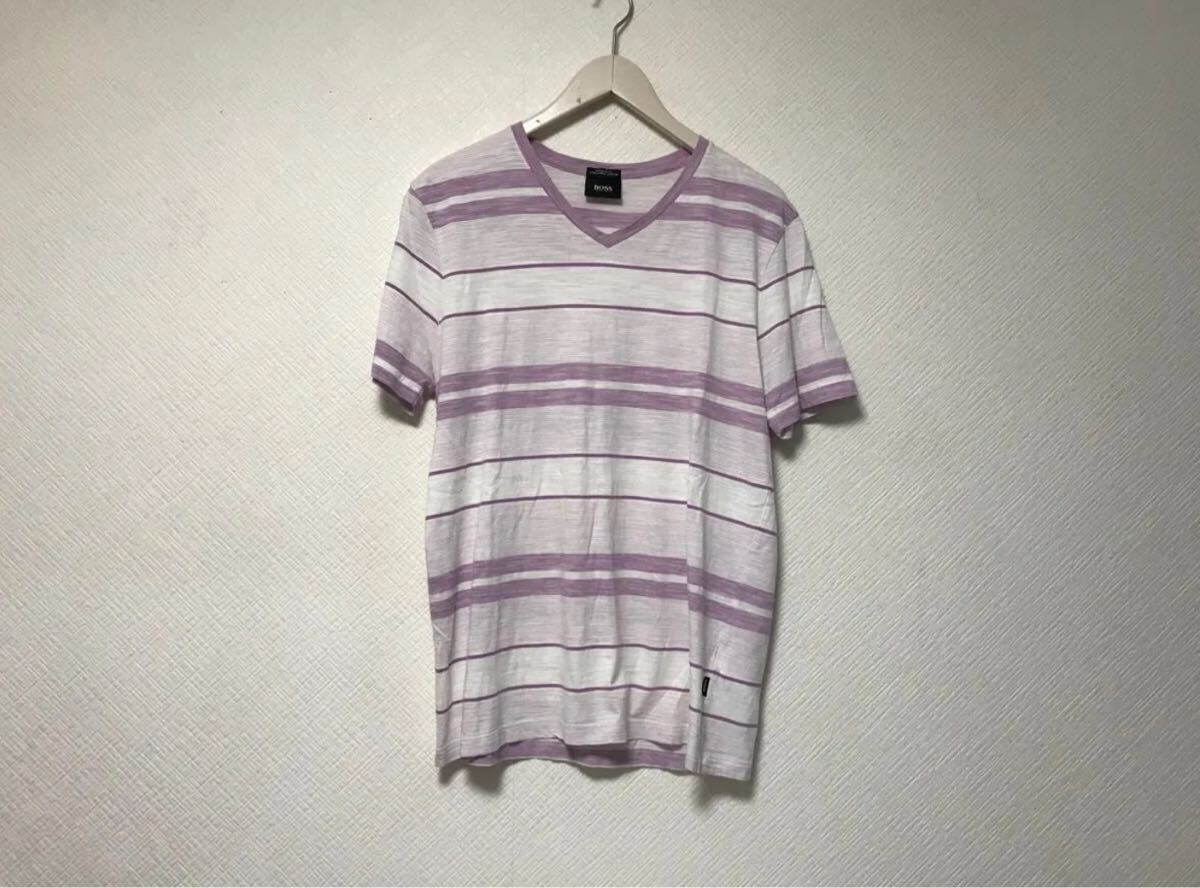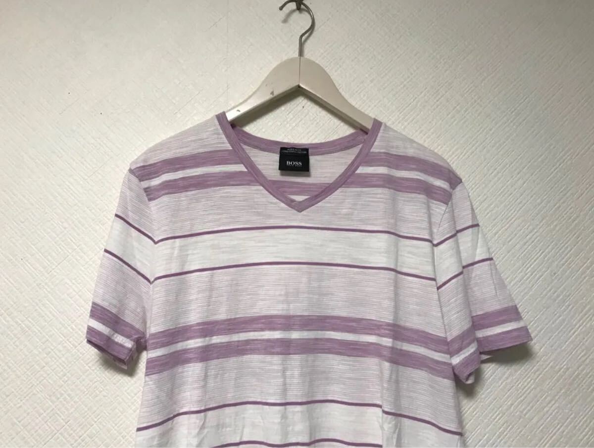商品名:本物ヒューゴボスHUGOBOSSコットンボーダー柄Vネック半袖Tシャツメンズサーフアメカジミリタリーストリートスケーターワークビジネススーツモードゴルフ白ホワイトピンクMペルー製